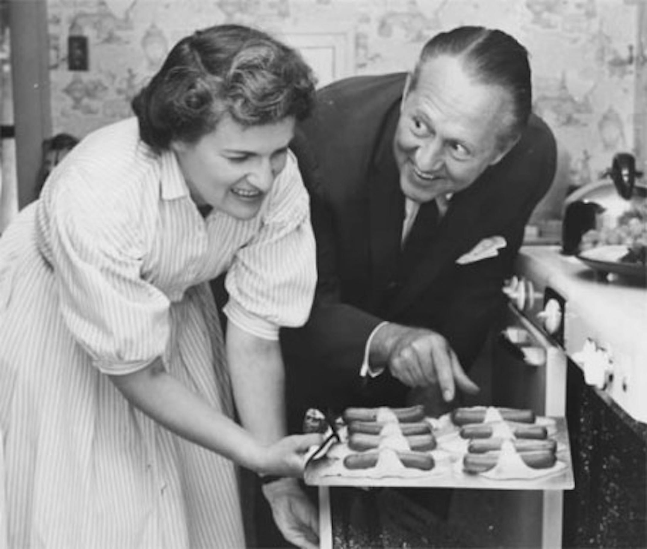 By the way, this newspaper used to have a beloved food writer named Mary Hart. Here she is with Art Linkletter; the caption says he is admiring her pigs in a blanket, but she doesn't seem happy with them at all.