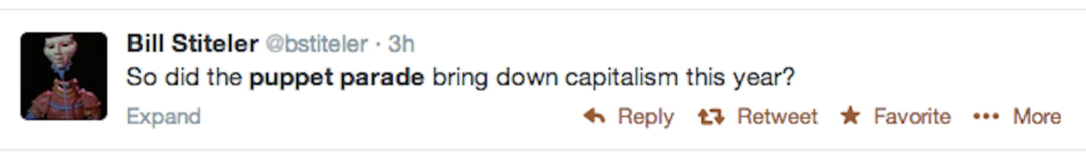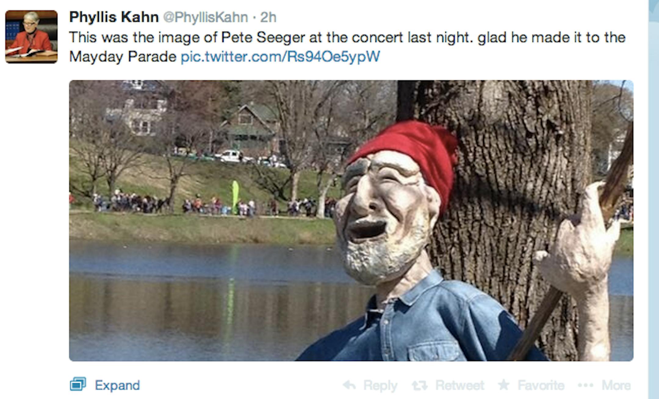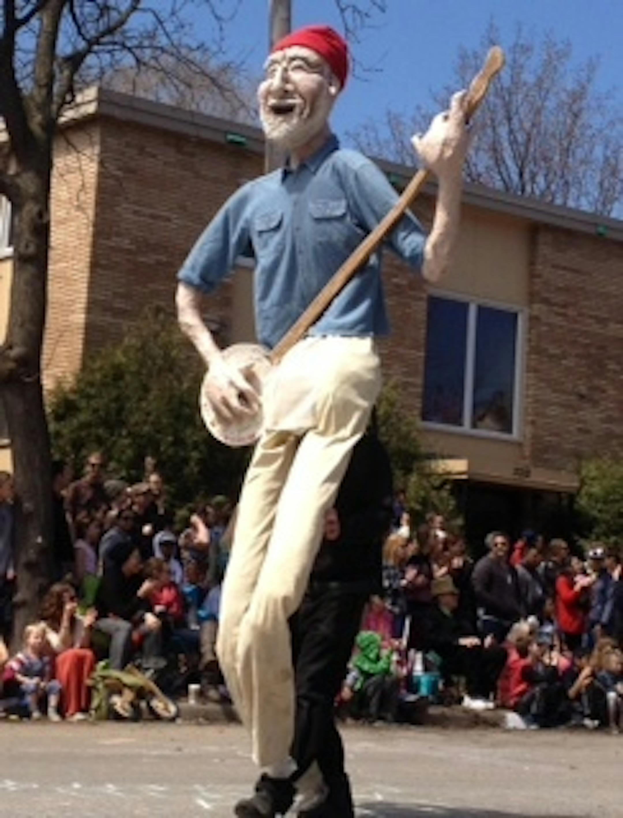 At some parades, first ladies and firefighters and football players make guest appearances. At the MayDay Parade in Powderhorn Park, Pete Seeger is the surprise guest--all 12 feet of him, his giant smiling visage reaching as high as the barely-there-but-still-there tree buds.