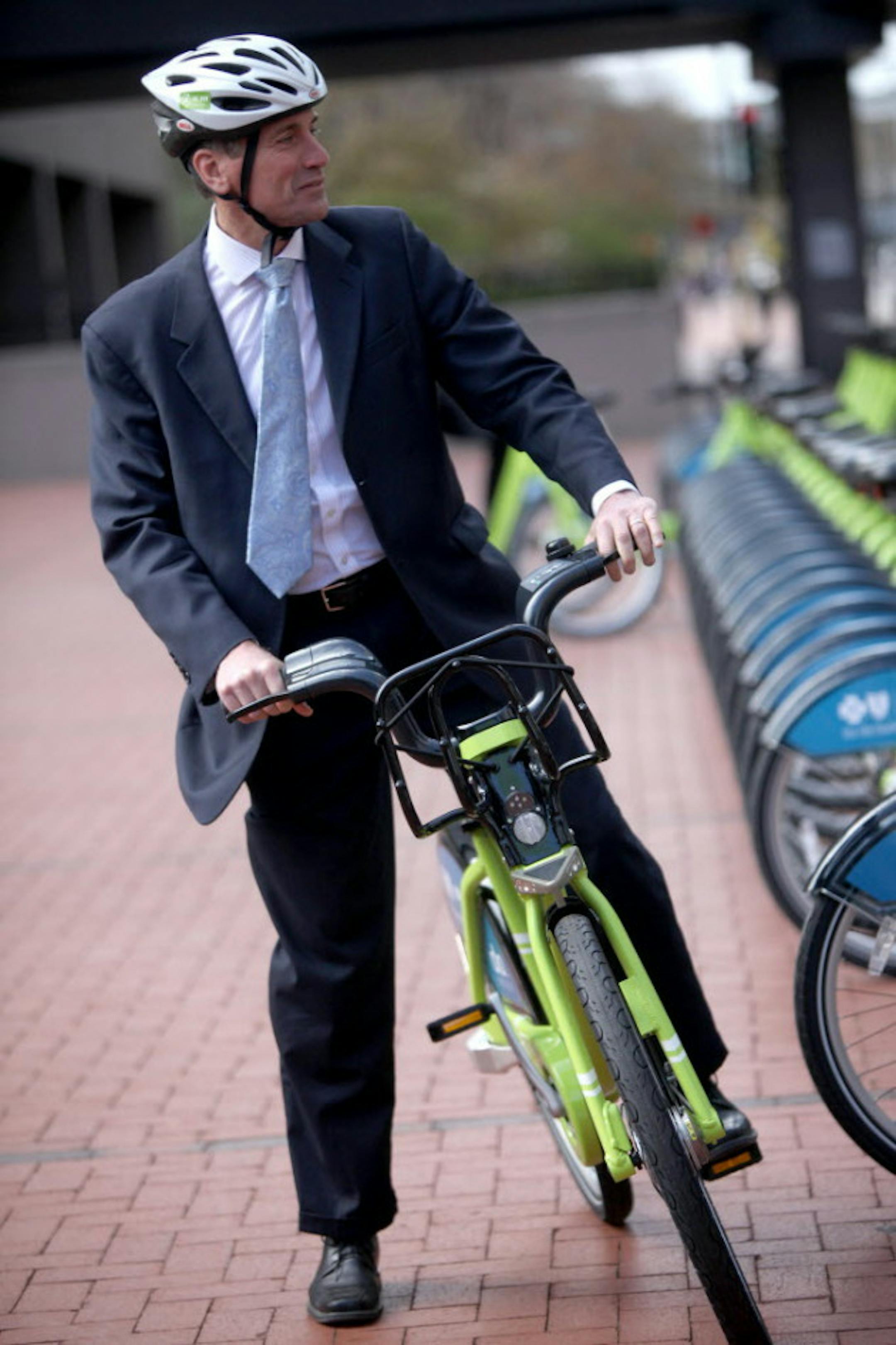 Festivities begin at 11 a.m. Thursday at Fort Snelling Visitors Center and includea bike ride along with remarks by Nice Ride Executive Director Bill Dossett, Hennepin County Commissioner Peter McLaughlin, Minneapolis Park Board President John Erwin and Dave Spalding of Blue Cross and Blue Shield of Minnesota, one of the main financial sponsors of the bike sharing program.