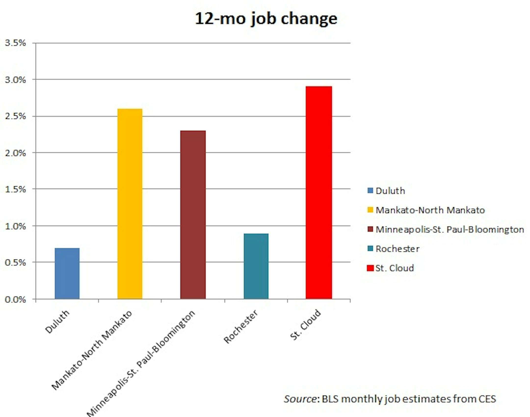 The one weak spot in Duluth has been overall job growth. The city is adding jobs slower than the rest of Minnesota. The metro area created only 947 jobs in the 12 months that ended in August, a growth rate of 0.7 percent.
