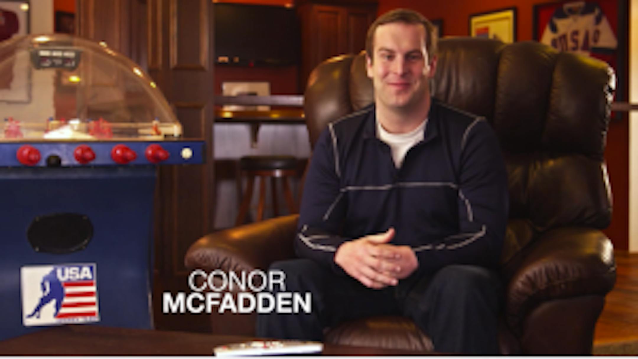 In the advertisement, Conor McFadden sits next to a hockey table with a USA Hockey logo emblazoned on the side. However, the ad appeared to have vanished from the internet.