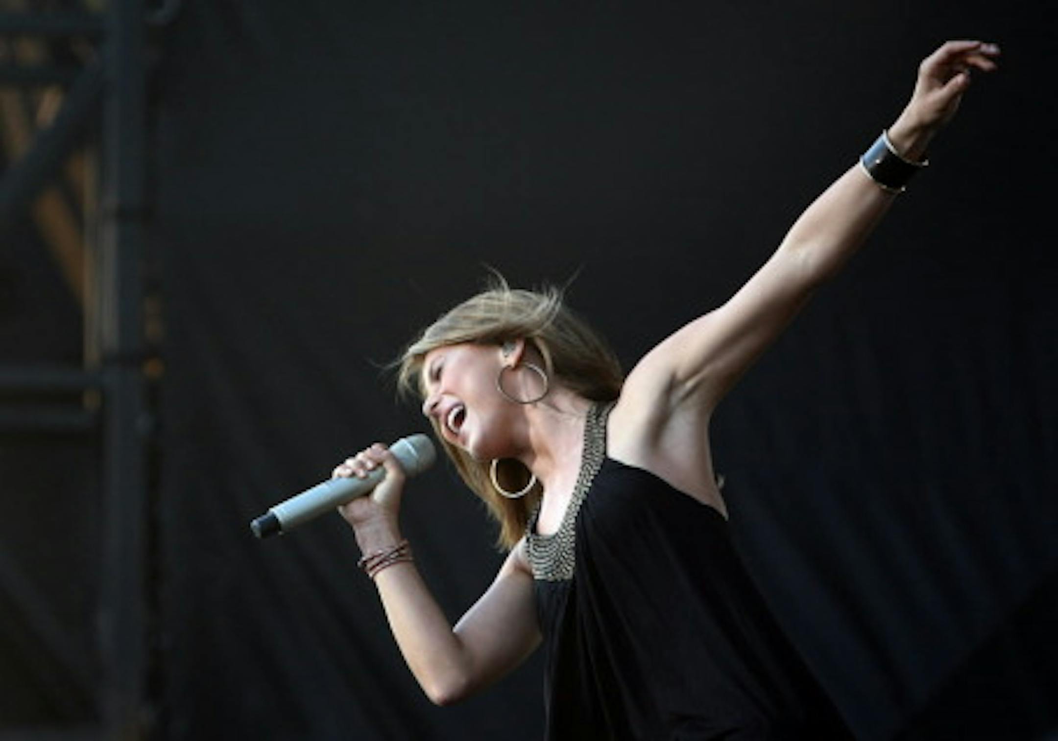 Saturday night live concerts mean early deadlines for the Star Tribune. So some readers of the Metro edition of the paper may have received the early version (mid-concert) of my review (if there wasn't anything about opening act Julianne Hough, you got the first version). Others received the late review, written after the concert. For McGraw, this was a post-Southern Voice Tour gig, meaning a no-frills production. Explained the superstar: "We don't [bs], we just play music." That's what he and the Dancehall Doctors did for 95 minutes. The set might have seemed a bit short (it was about the same length as a similar no-frills show to inaugurate the new 3,000-seat events center at Treasure Island Casino in Red Wing in 2008) but the sell-out crowd of 13,240 liked it, they loved it, they would have welcomed more of it (like Don't Take the Girl). Acutely aware of where he was performing, McGraw mentioned "Vikings country" at the end of Where the Green Grass Grows. He pledged allegiance to his homestate New Orleans Saints and then acknowledged that he's been a "pretty big fan of No.4 my whole life," referring to his now-buddy Brett Favre (to whom he dedicated a tune). McGraw is clearly a fan, as well, of Jackson Browne (Tim's Sing Me Home echoed a Browne ditty) and Bruce Springsteen (Tim's preacher-like intro to Things Change sounded like it was copped from a Boss concert). At least in Southern Voice, McGraw name-checked many of his influences, including Chuck Berry and Tom Petty (whose sounds could be heard in the song). As for Hough, the 22-year-old dancing queen looked like Kelly Ripa (with honey hair; it's no longer brassy blonde) trying to become Shania Twain. The perky, pretty newcomer had a Reba-like break in her voice but it was a wisp of a voice (with a curious Southern accent for a Utah native now living in Los Angeles) that was as anonymous as her songs. Carrying on for 55 minutes was probably twice as long as we needed from Hough. The 13.240 fans could have used more from the hunk and less from the hottie. Here is McGraw's grandstand set list: Real Good Man/ Last Dollar/ Where the Green Grass Grows/ Let It Go/ She's My Kind of Rain/ Back When/ Just to See You Smile/ Still/ Down on the Farm/ Everybody Hates Me/ Indian Outlaw (dedicated to Favre) / Tiny Dancer (Elton John)/ It Felt Good on My Lips/ Things Change/ I Like It, I Love It/ BBQ Stain/ Southern Voice ENCORE Sing Me Home/ Angel Boy/ Live Like You Were Dying/ Cowboy in Me