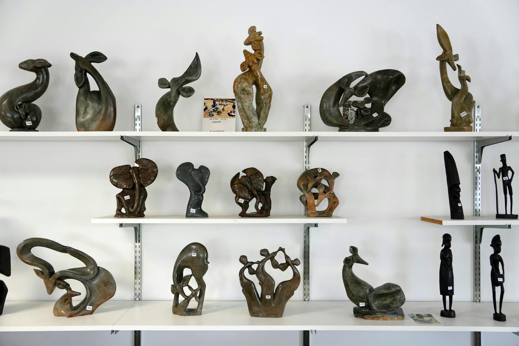 The spacious gallery is filled with Zimbabwe stone sculptures made of springstone, serpentine, opal stone and other stones. They depict families, pregnant women, mothers, daughters, sons and many animals.