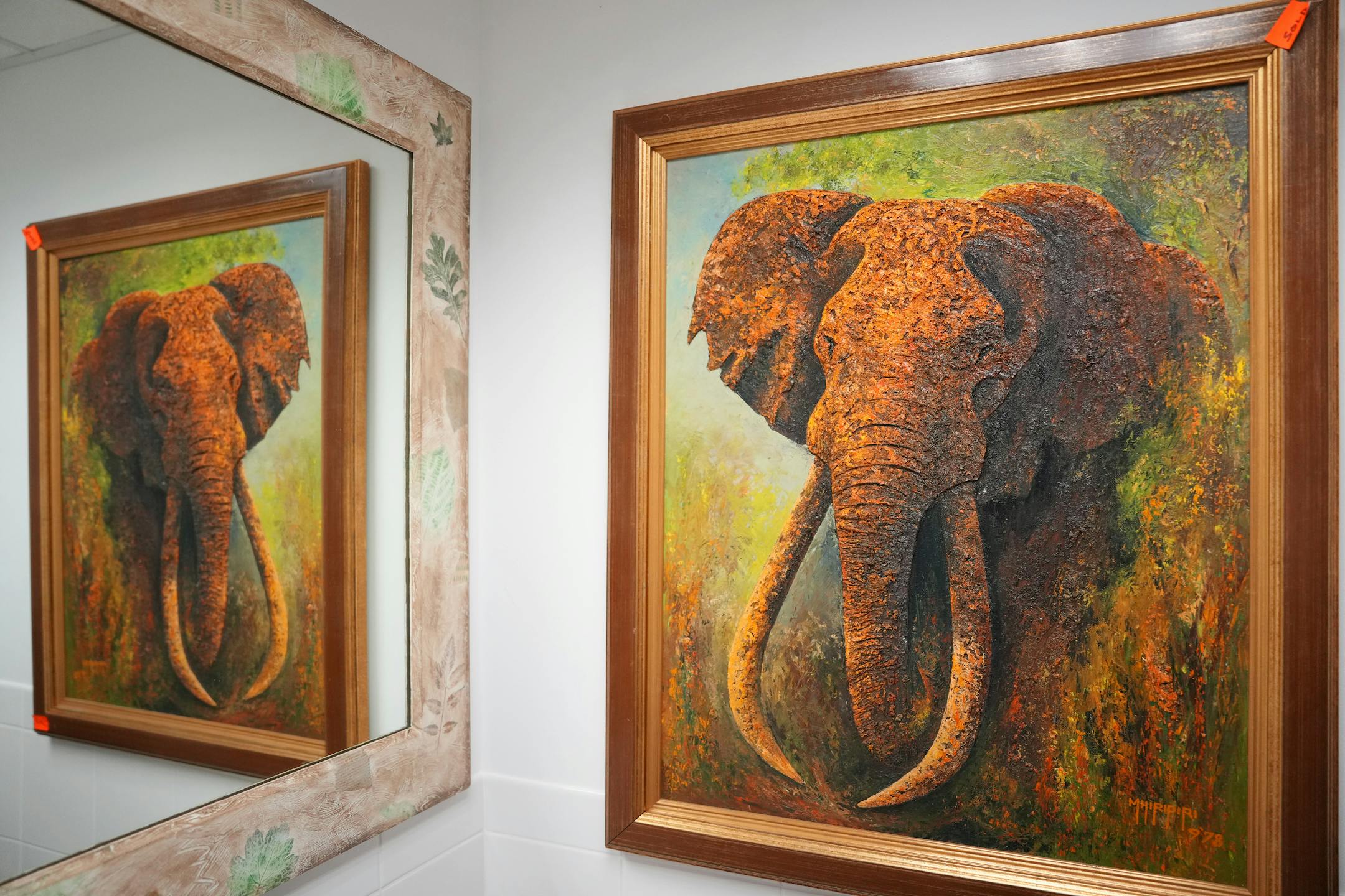 African masks and Mhiripiri’s paintings of elephants, other animals and landscapes cover the walls. Prices range from $15 to $150,000.