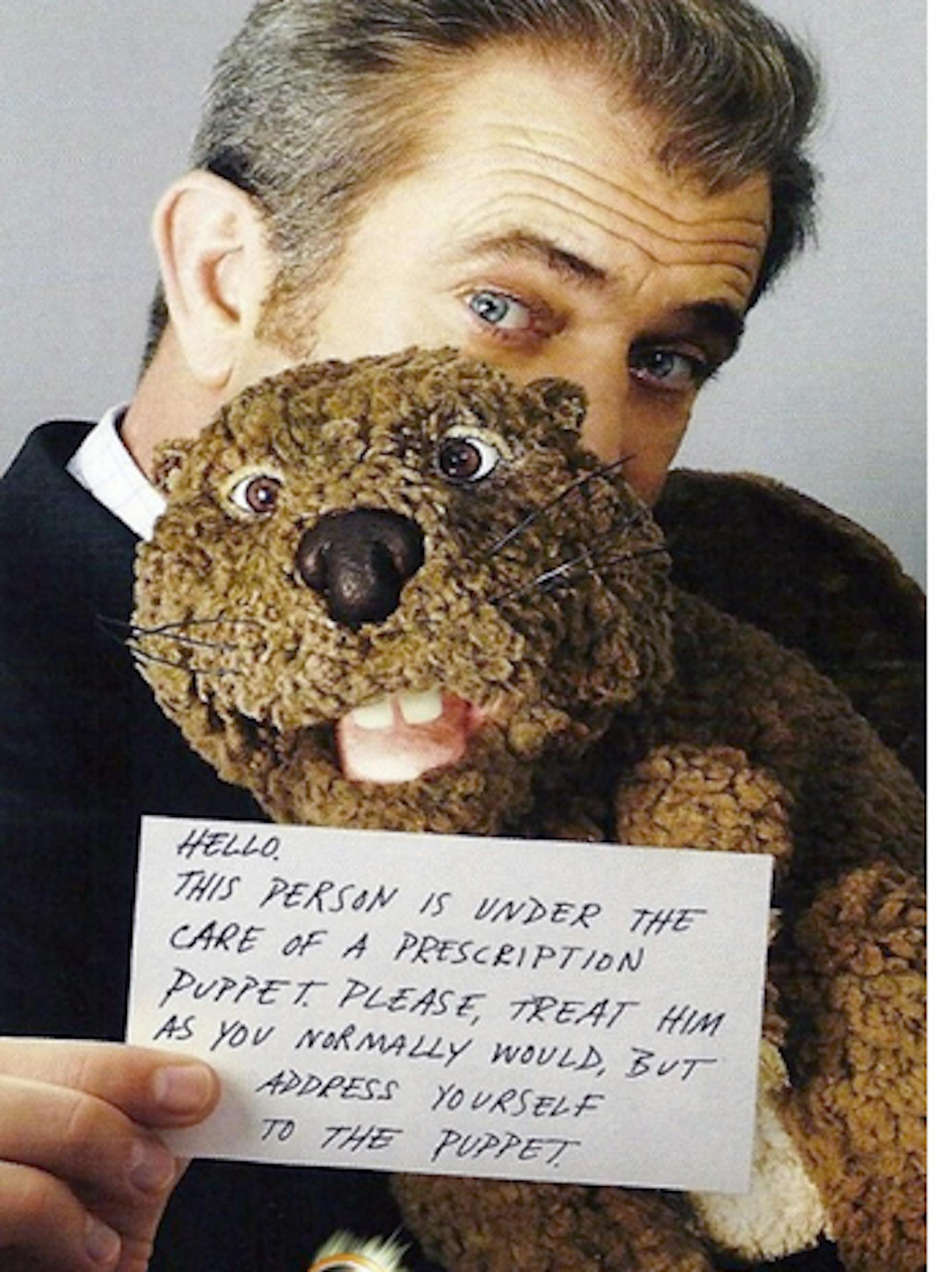 And this one, from his new movie about the guy who only communicates through a hand-puppet. Correction: a prescription puppet.