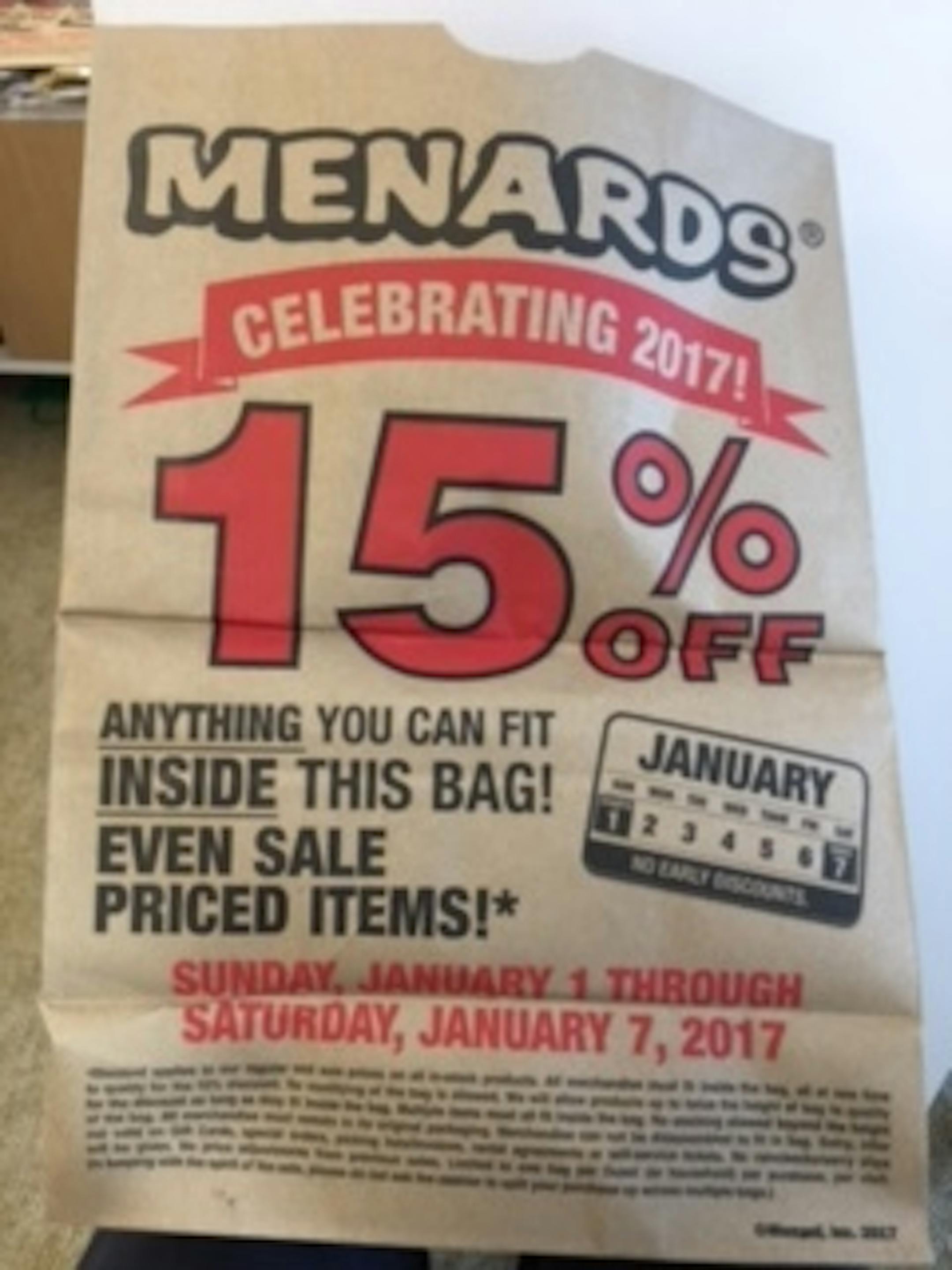 Consumers who have grown used to the 11% rebate promotions at Menards will appreciate a more generous offer through Saturday. Menards brought back its bag sale, which was included in the Sunday, Jan. 1 newspaper.