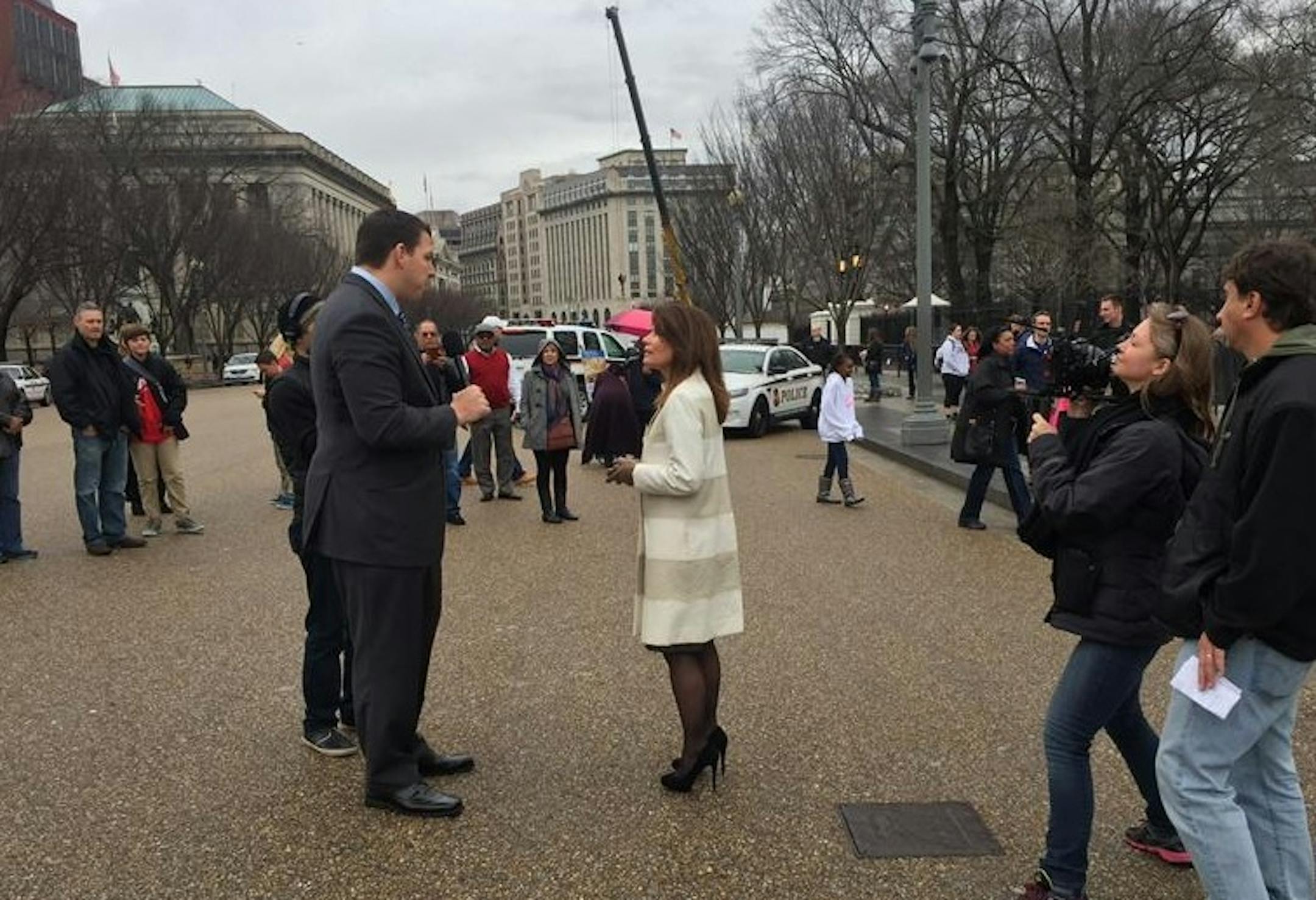 Bachmann participated in filming in front of the White House Wednesday morning. Director Anthony C. Ferrante said. Bachmann's scene is with Washington Redskins player Tom Compton, who plays a reporter interviewing her.