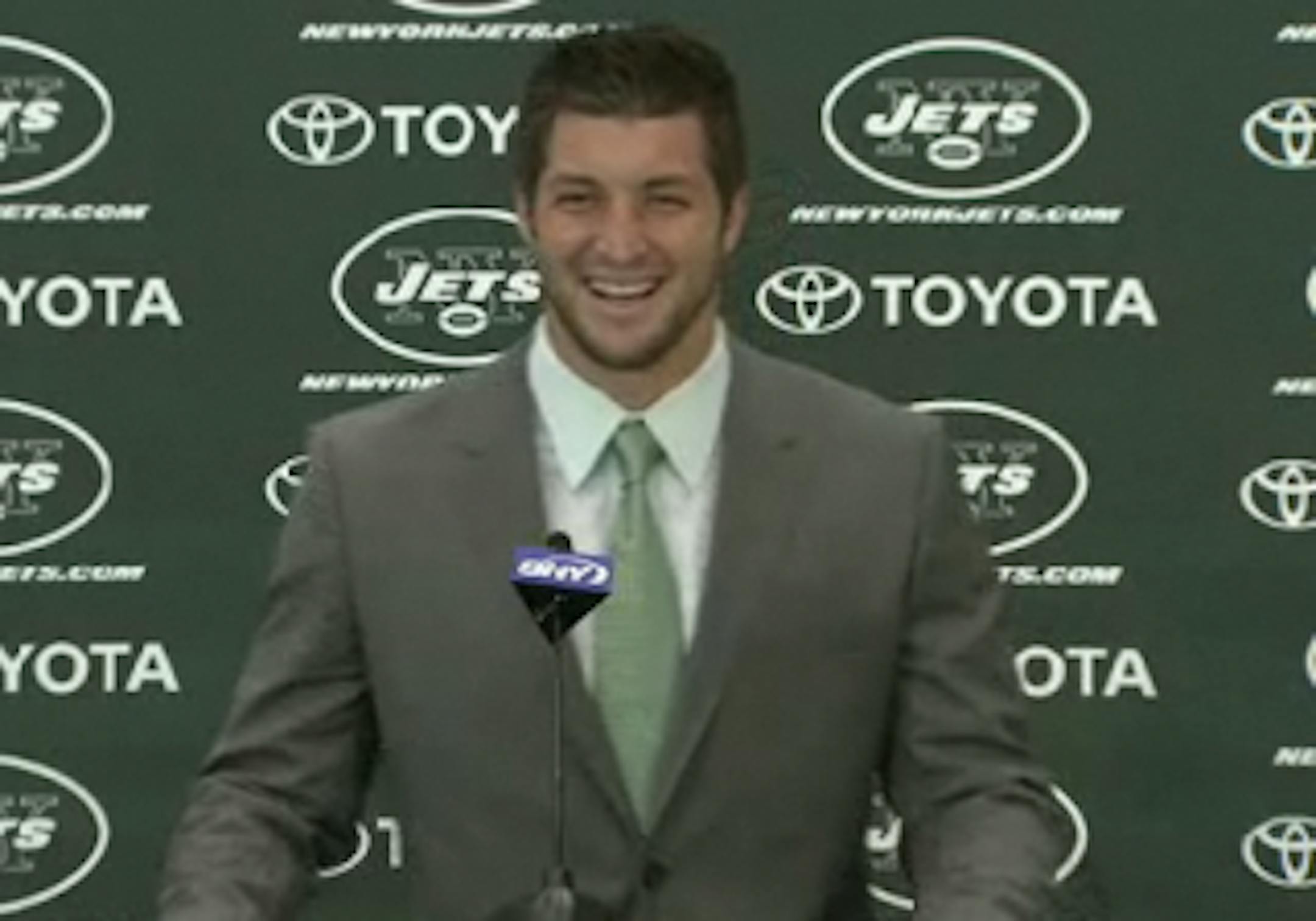 Tim Tebow spent more than 30 minutes at the podium on Monday in what was perhaps the longest and most well-attended press conference for a backup quarterback in NFL history (which hilariously was going on in NYC at the same time as the NIT pre-tourney press conference). A few of the highlights: