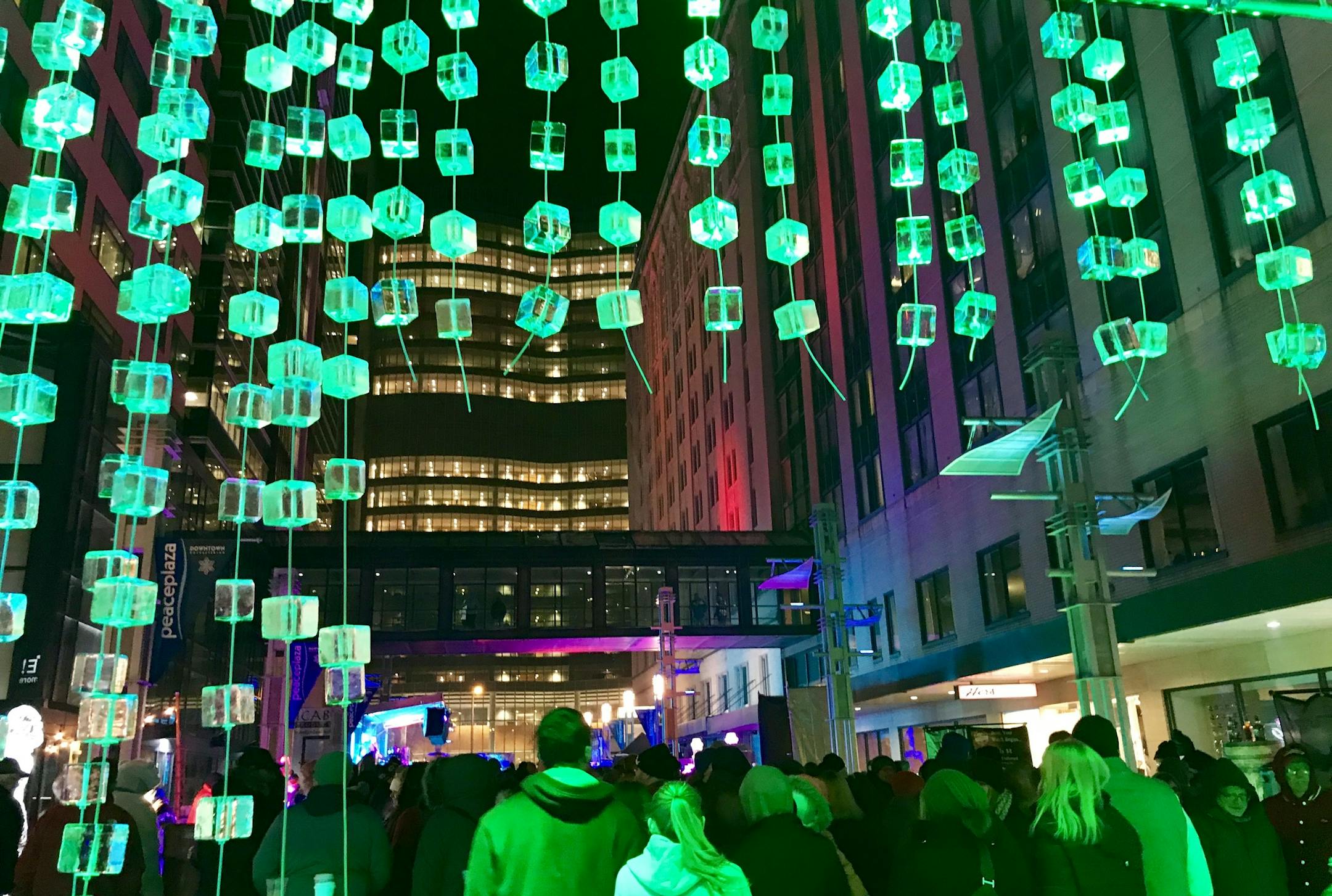 Color-changing lights illuminate a welcoming curtain of ice cubes as bundled attendees flow into Peace Plaza. The three-night ice-bar festival started with 250 people in 2009 and grew to 51,000 last year.
