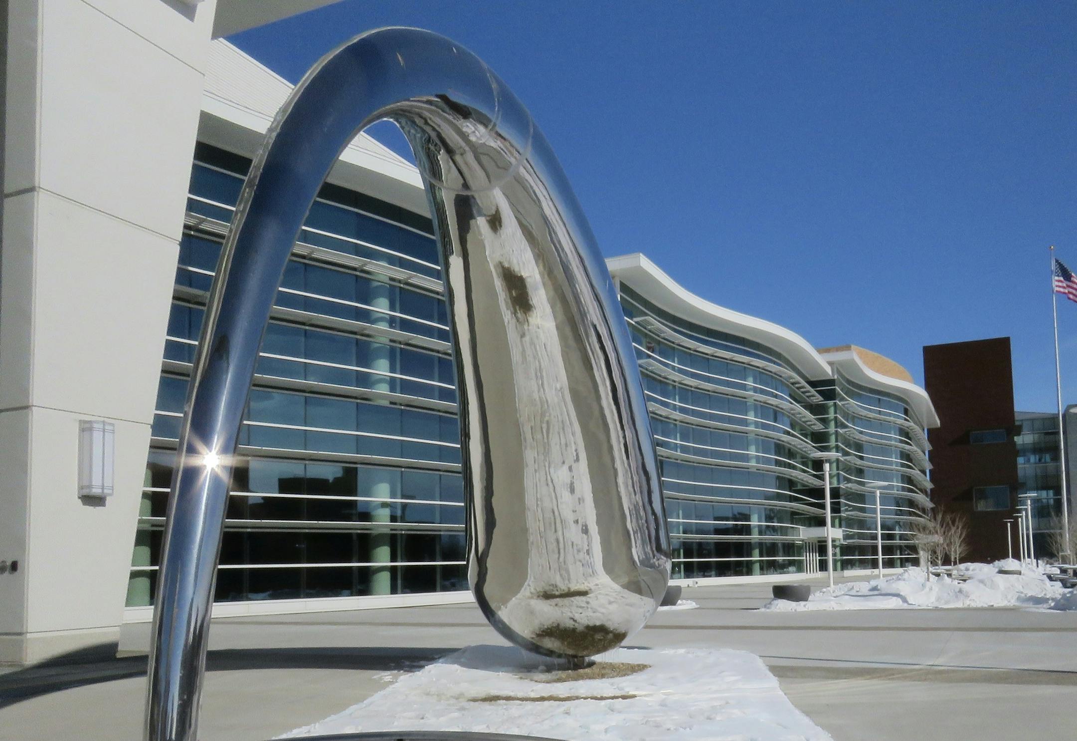 What looks like a supersized, sideways drop of water outside Rochester's Mayo Civic Center conjures images of Chicago, where the iconic "Cloud Gate" sculpture (aka the Bean) fascinates tourists. The shimmering surface distorts reflections of people walking past, with splashes of bright yellow or pink coats mirrored against a blue sky and white snow in what some have dubbed the Mini-Bean.