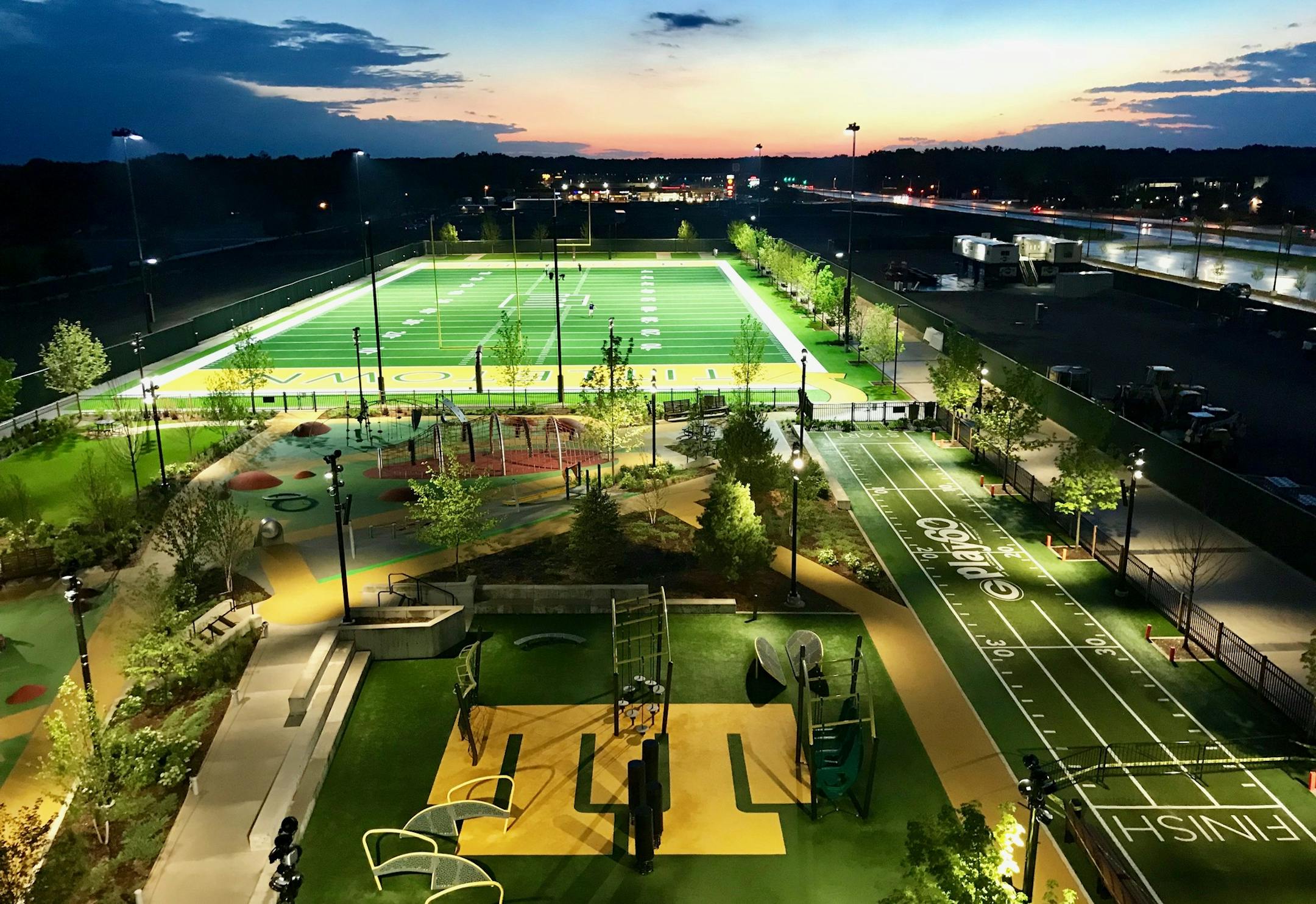 Metal bench seating gleams silver as it encircles the field, snugging right up to the edge. "They're climate-controlled," Neidenbach jokes. "They get really hot on a sunny day and really cold on a winter one."