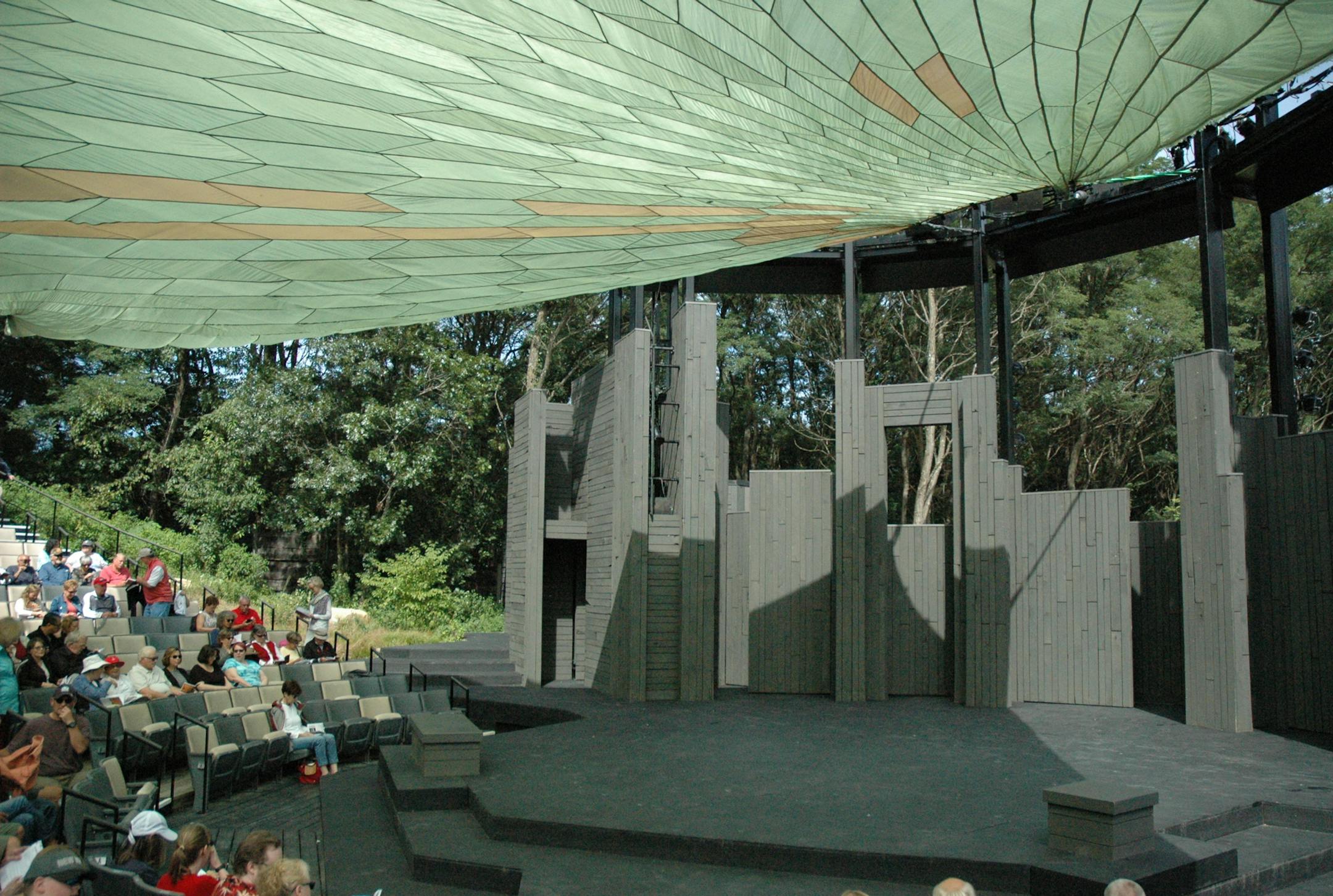 He was right. I thoroughly enjoyed the production and the experience of visiting APT, which is located in a hilly wood, with a vast picnic area so visitors can make a day of it. The company has an indoor stage (the Touchstone Theatre) and an outdoor stage (the Hill Theatre), both of which are a bit of a walk from the parking lot. (If you go, wear sensible walking shoes.) The Hill Theatre has wonderful acoustics, and a neat silky canopy lofted over the stage and audience, to protect from the glare of the sun. The actors, meanwhile, are top-notch.