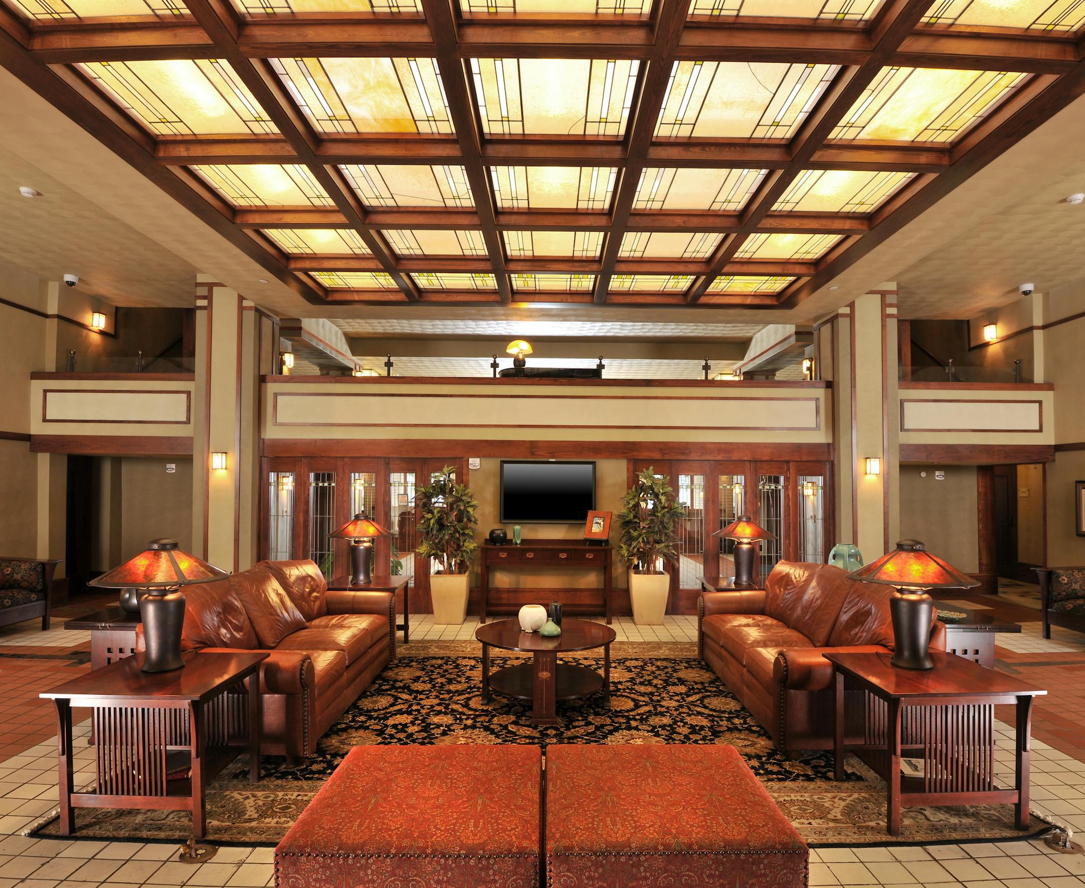 Unwind with a book on a leather couch in the expansive lobby, resplendent in Prairie-style furnishings, while a self-playing grand piano trills in the background. Come evening, try your hand at a game of pool in the subterranean 1910 Lounge.