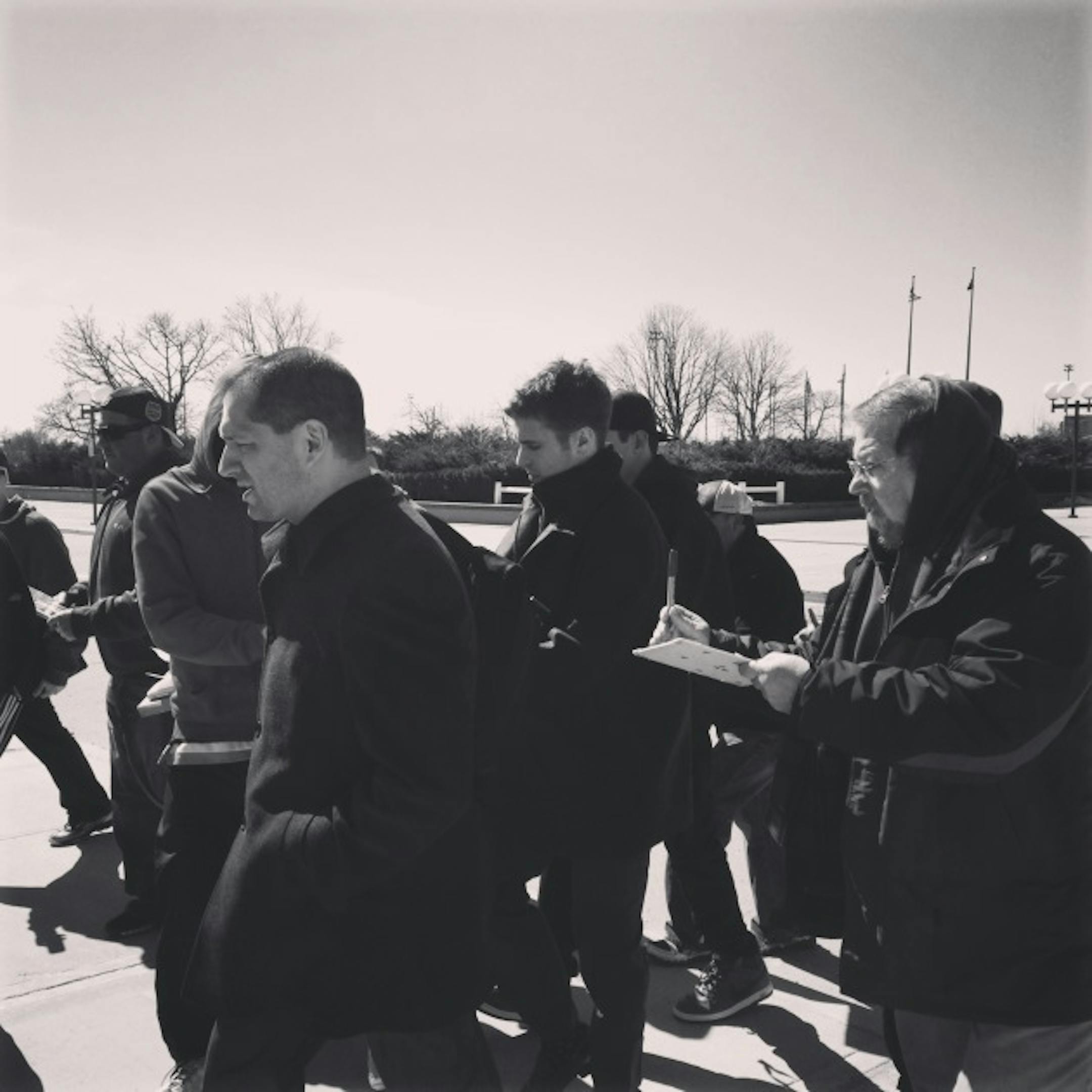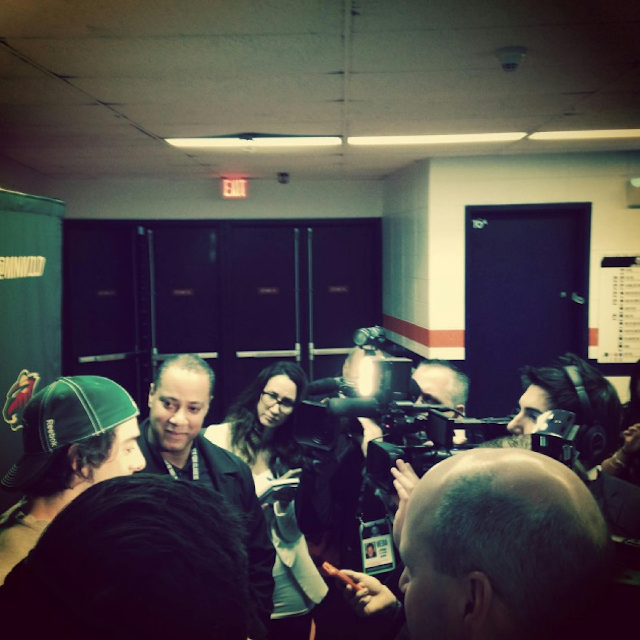 That's Frank Buonomo in the foreground, the Wild's team services dude. He used to handle Sidney Crosby. One of the autograph guys goes, "Hey, didn't you used to work for the Penguins?" That was pretty funny.