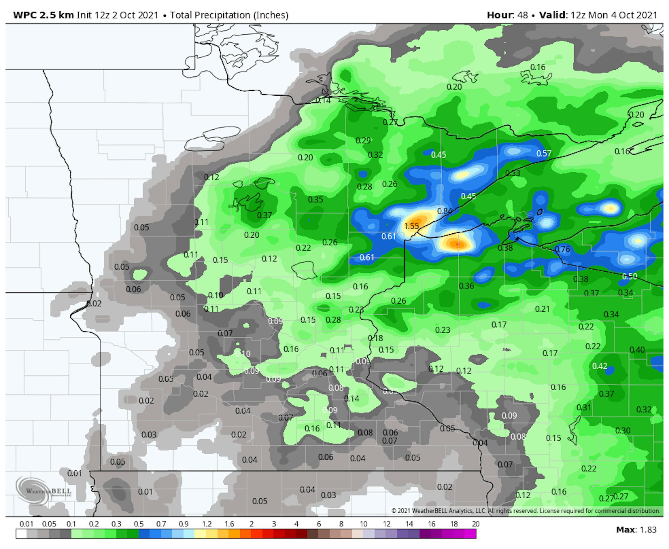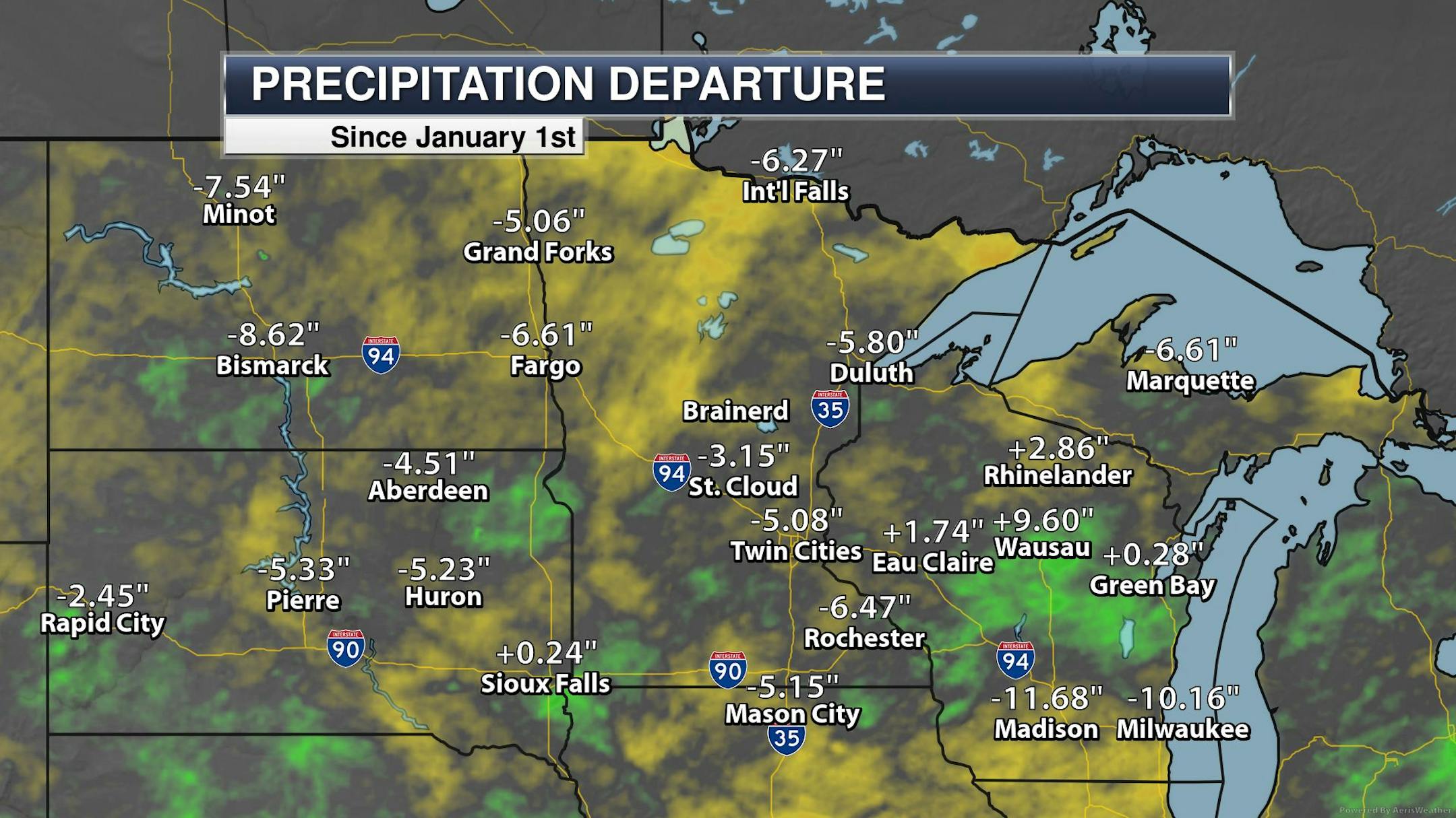 Here's a look at the precipitation departure from average since January 1st and note that most locations are still several inches below average. Some of the biggest deficits include Bismarck, ND (5th driest January 1st - October 1st on record) and Minot, ND (1st driest such period on record). The Twin Cities The metro is still nearly -5.00" below average since January 1st, which is the 54th driest January 1st - October 1st on record. Meanwhile, Wausau, WI is nearly +9.60" above average precipitation for the year and is sitting at their 3rd wettest start to any year on record.