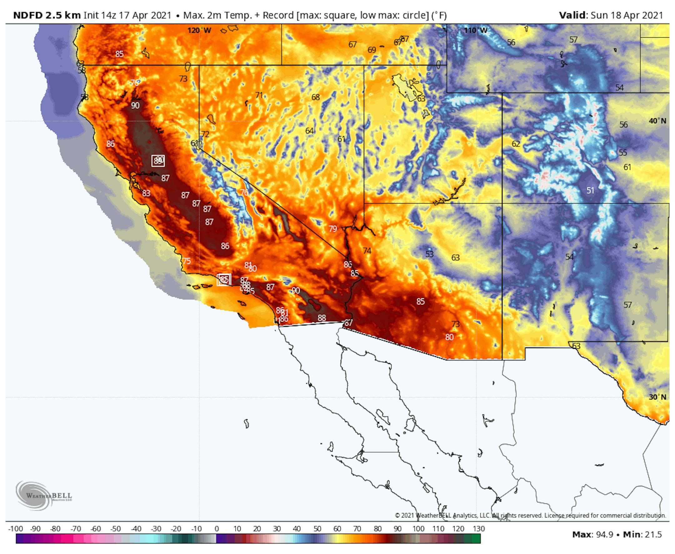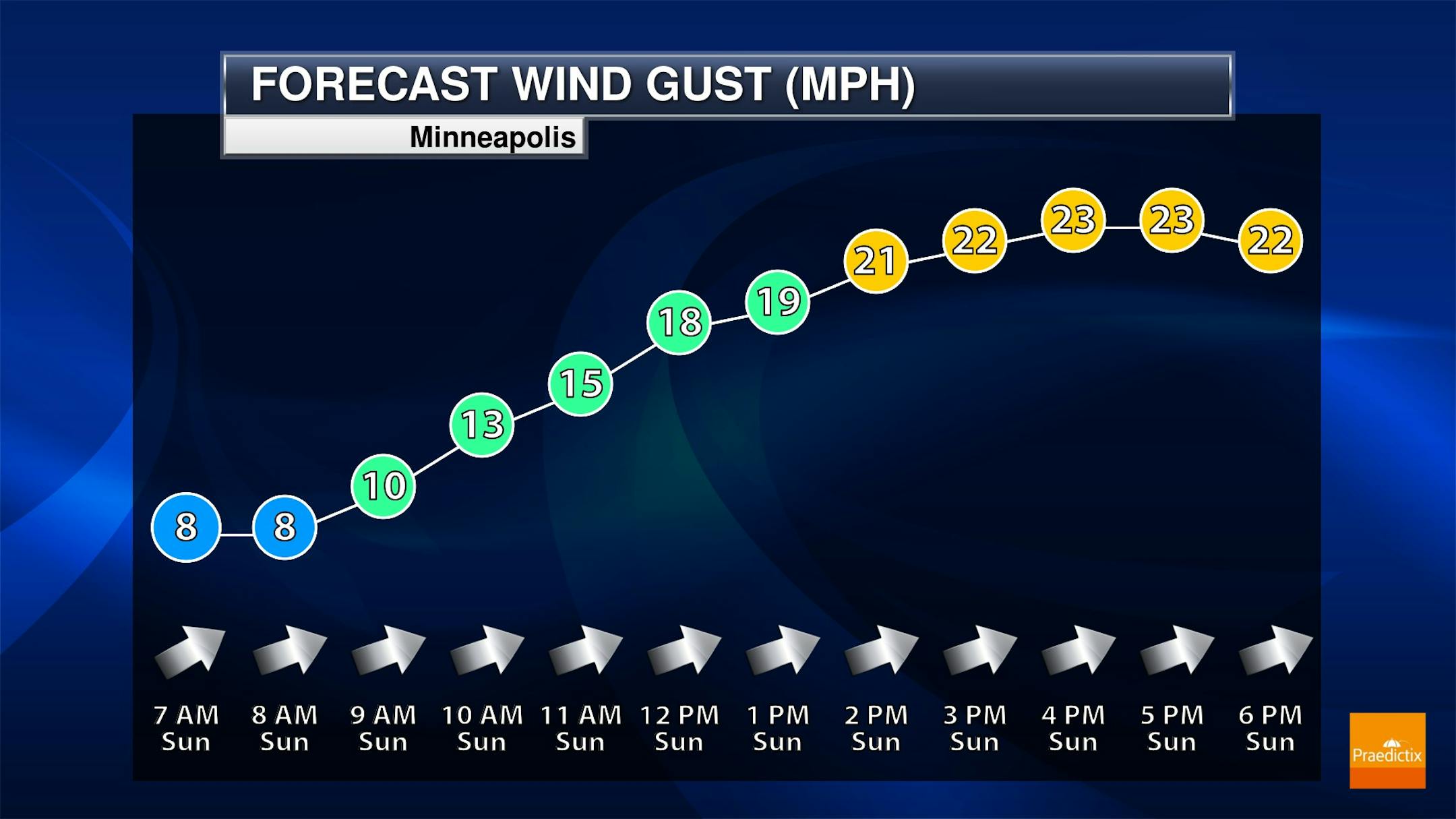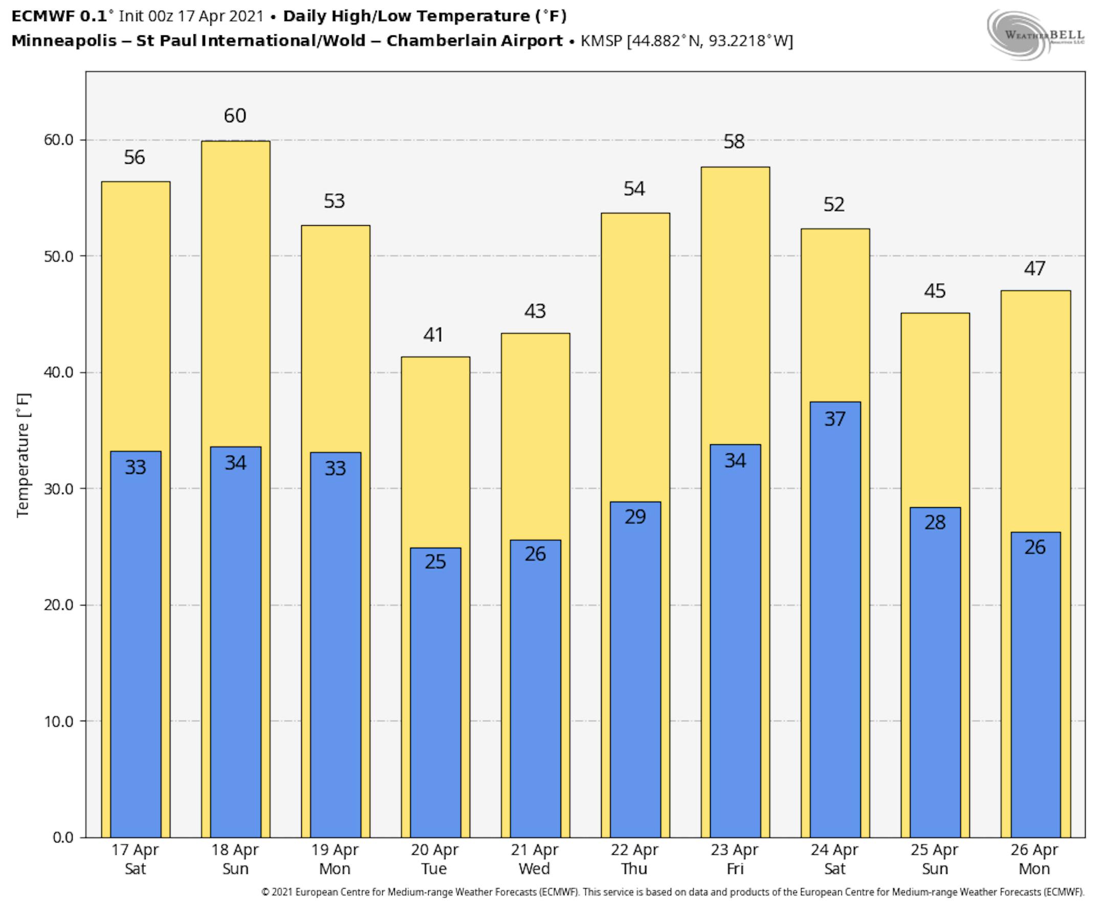 Here are the meteorgrams for Minneapolis on Sunday, which show temps warming quickly into the 50s by mid/late morning and into the lower 60s through the afternoon. Keep in mind that a cold front will be approaching from the northwest, so clouds and wind gusts will be on the increase and the front gets closer later in the day. Wind gusts could exceed 20mph during the 2nd half of the day.
