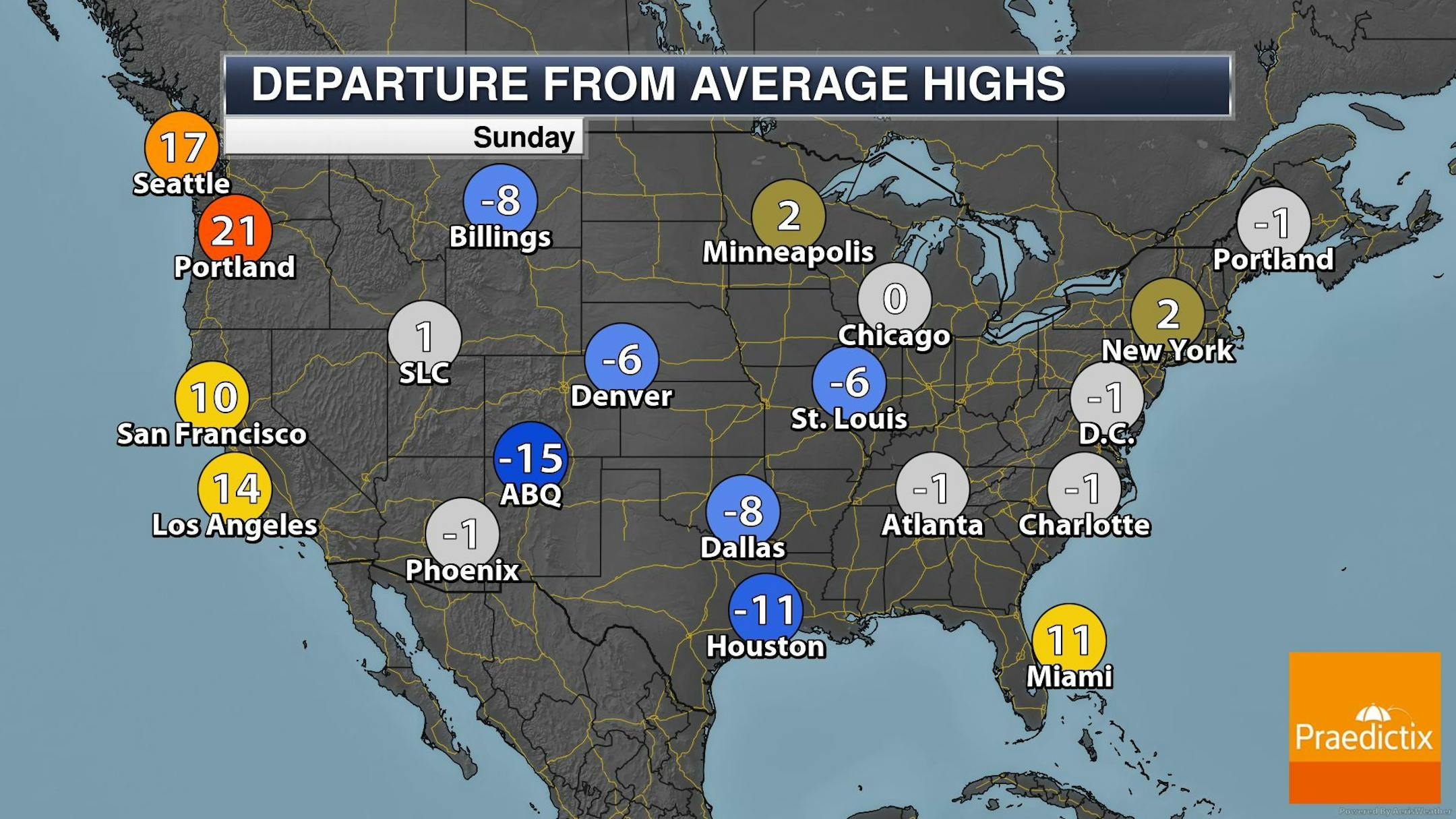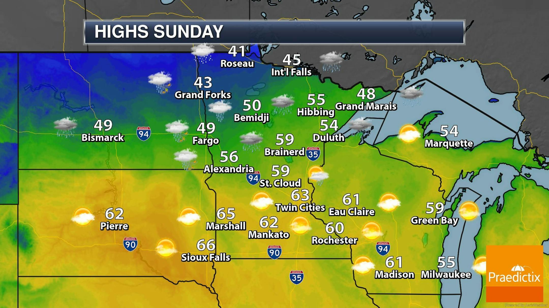 The weather outlook for Sunday shows fairly mild temps across the southern half of the state with readings warming into the low/mid 60s. However, folks in the northern part of the state will be dealing with areas of rain/snow as a front quickly approaches from the NW. This front will also be responsible for cooler temps, which will drop high temps into the 40s, nearly -10F to -15F below average for places like Grand Forks and Roseau.