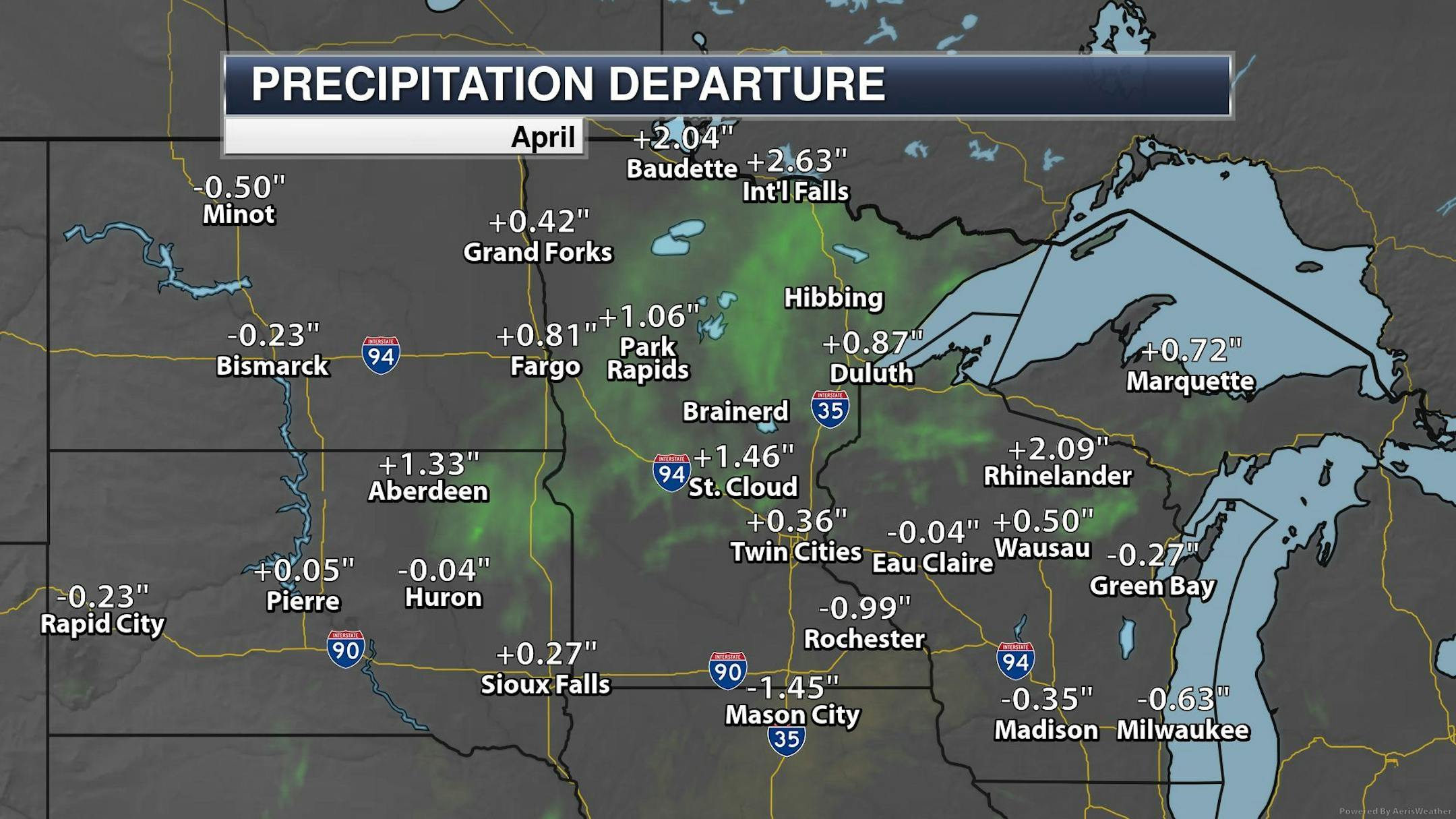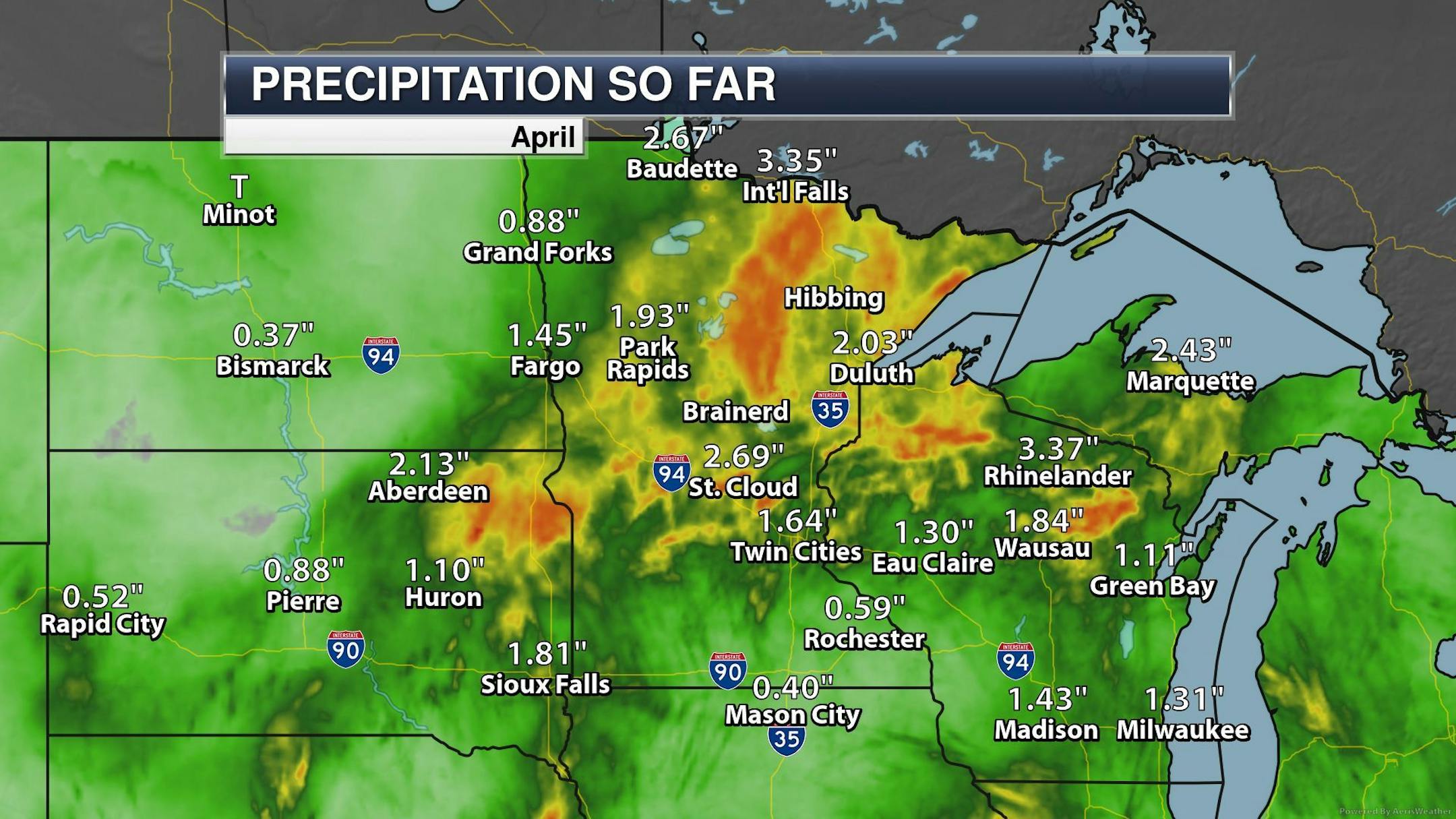 Here's how much precipitation we've seen so far this April. Note that some of the heaviest has been across the central and northern part of Minnesota with widespread 1" to 2" + tallies, including the Twin Cities. International Falls has had more than 3" of precipitation so far this month with more on the way PM Sunday into Monday.