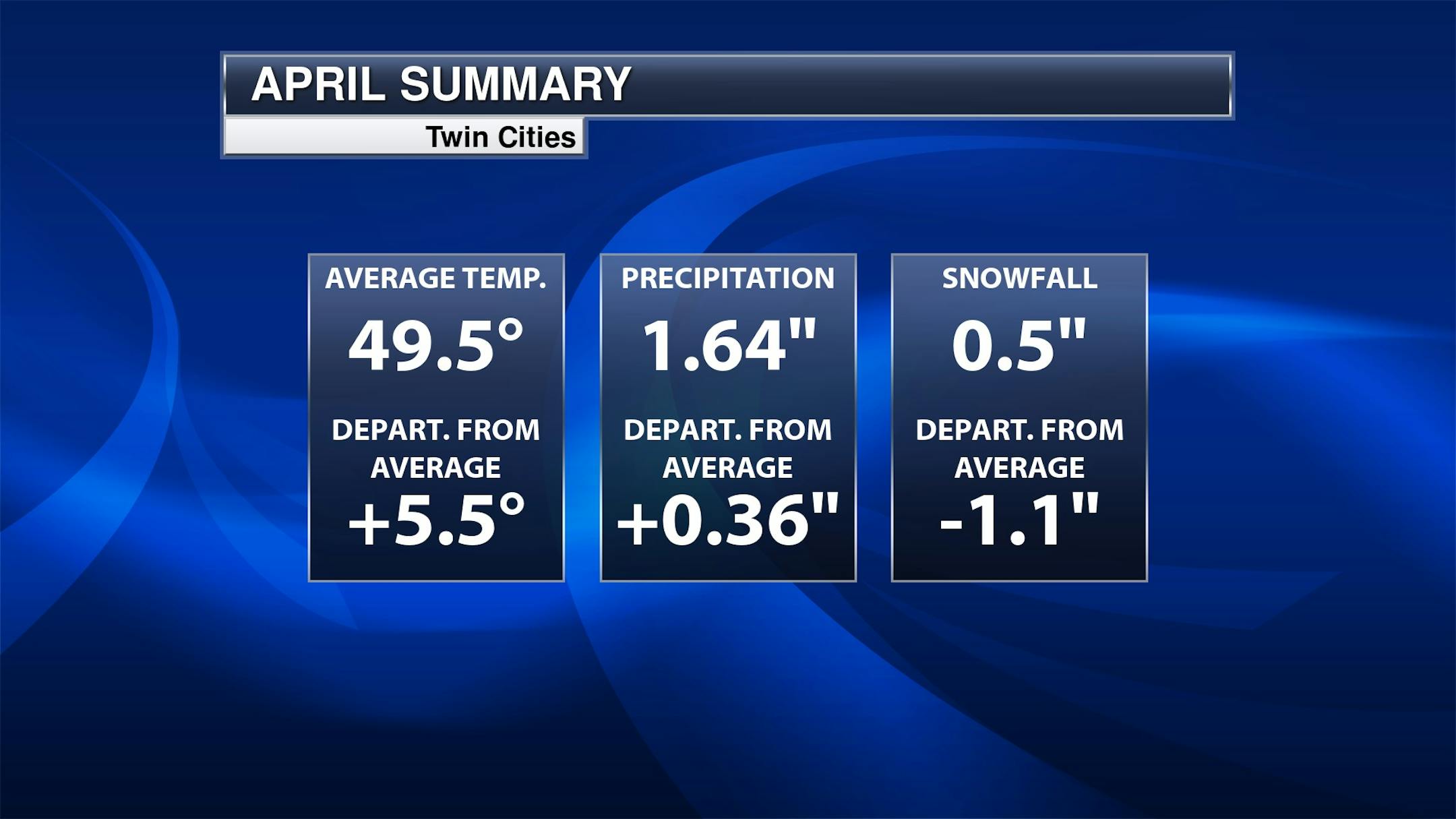 Here's the Twin Cities weather summary through the first half of April. Note that temps are still running nearly +5.5F above average. We're also running nearly +0.36" above average in the precipitation department and more than -1" below average in the snowfall department.