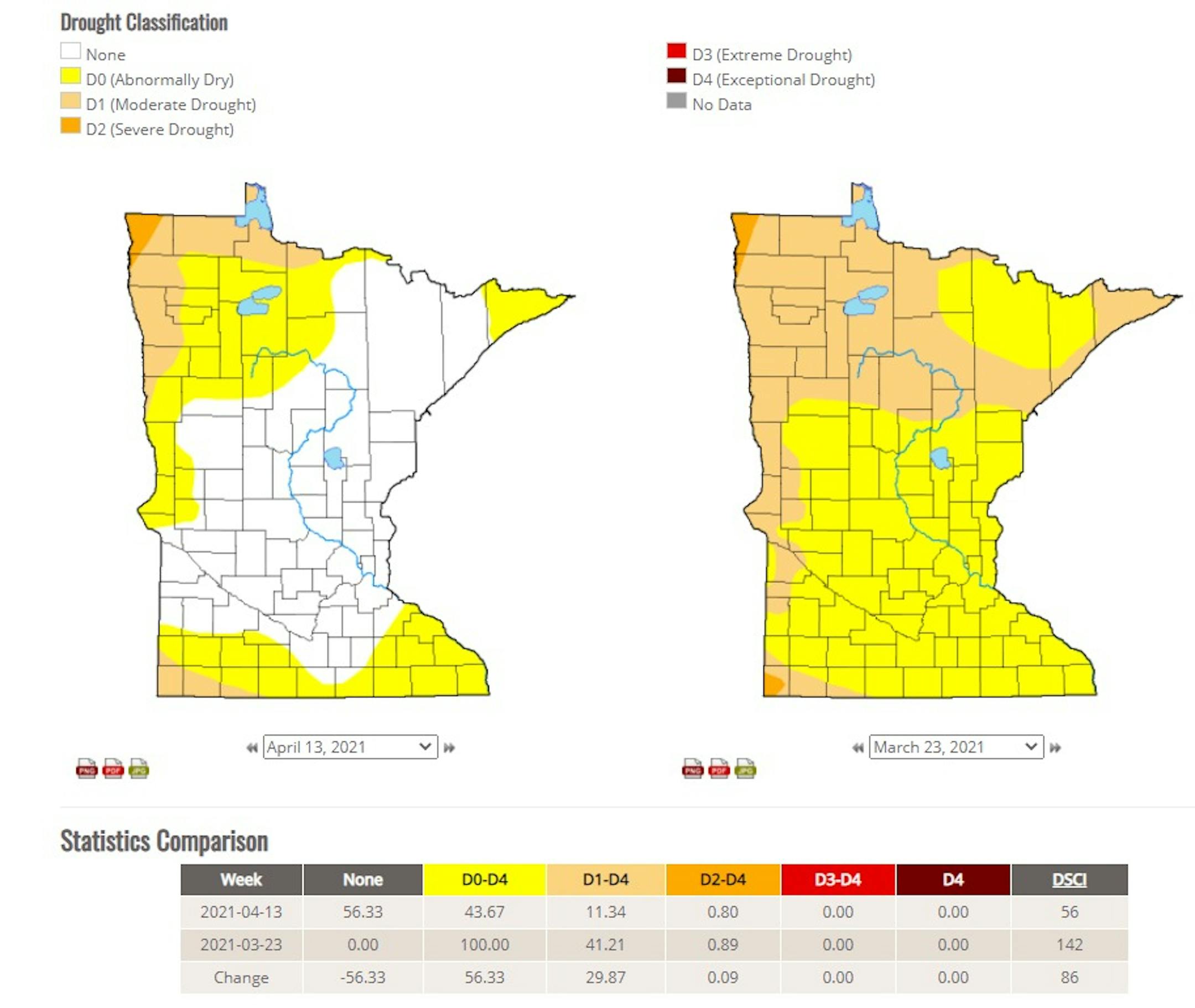 Take a look at the drought comparison around the state of Minnesota from April 11th vs March 23rd. Note that just a few weeks ago, the entire state was either abnormally dry or dealing with moderate drought. Since then, we've had quite a few days of rain and even snow, which has helped recharge the soil moisture across much of the state, for now. There are still a few areas in the northwestern and southwestern part of the state that are still dealing with drought.