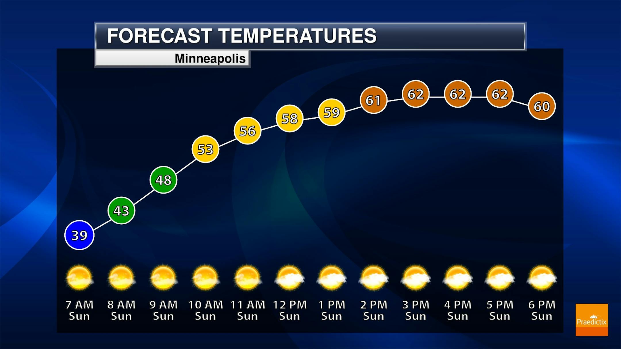 Here's a closer look at our weather conditions for Minneapolis on Sunday, which shows high temps warming into the low 60s during the afternoon hours. Winds will turn a bit breezy through the day as a cold front approaches from the northwest.