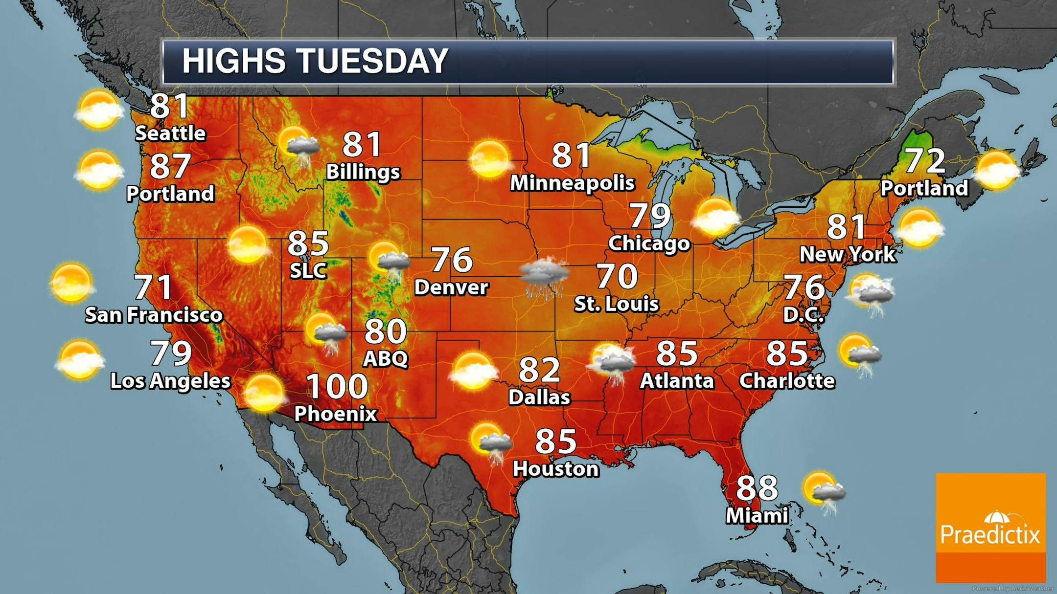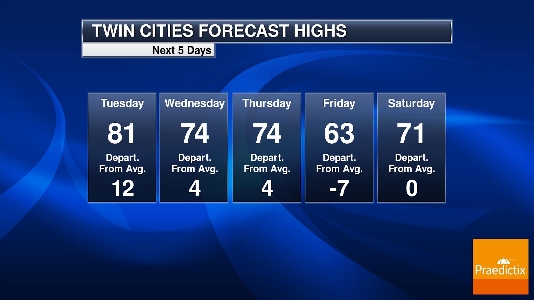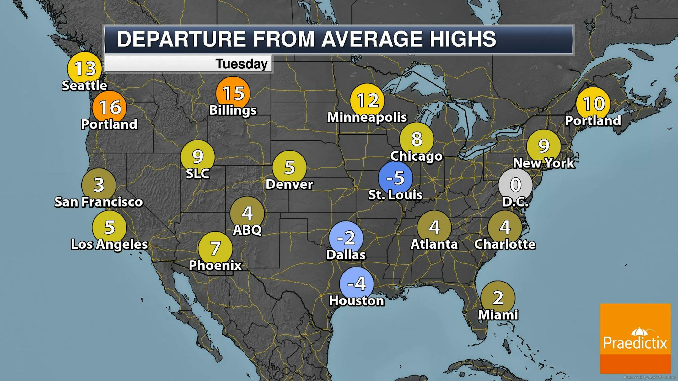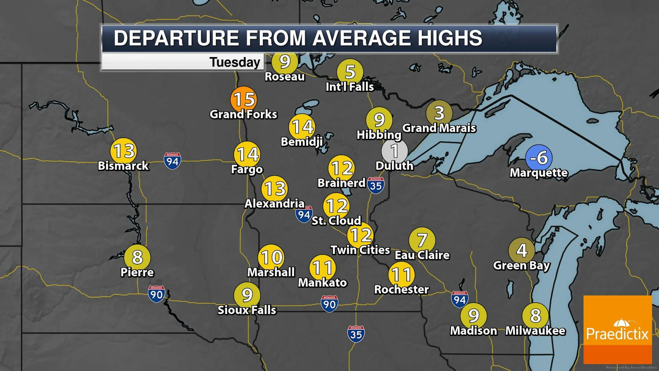 Temps on Tuesday will be nearly +10F to +15F above average across the region with highs warming into the 70s and lower 80s, which is more like mid-June standards.