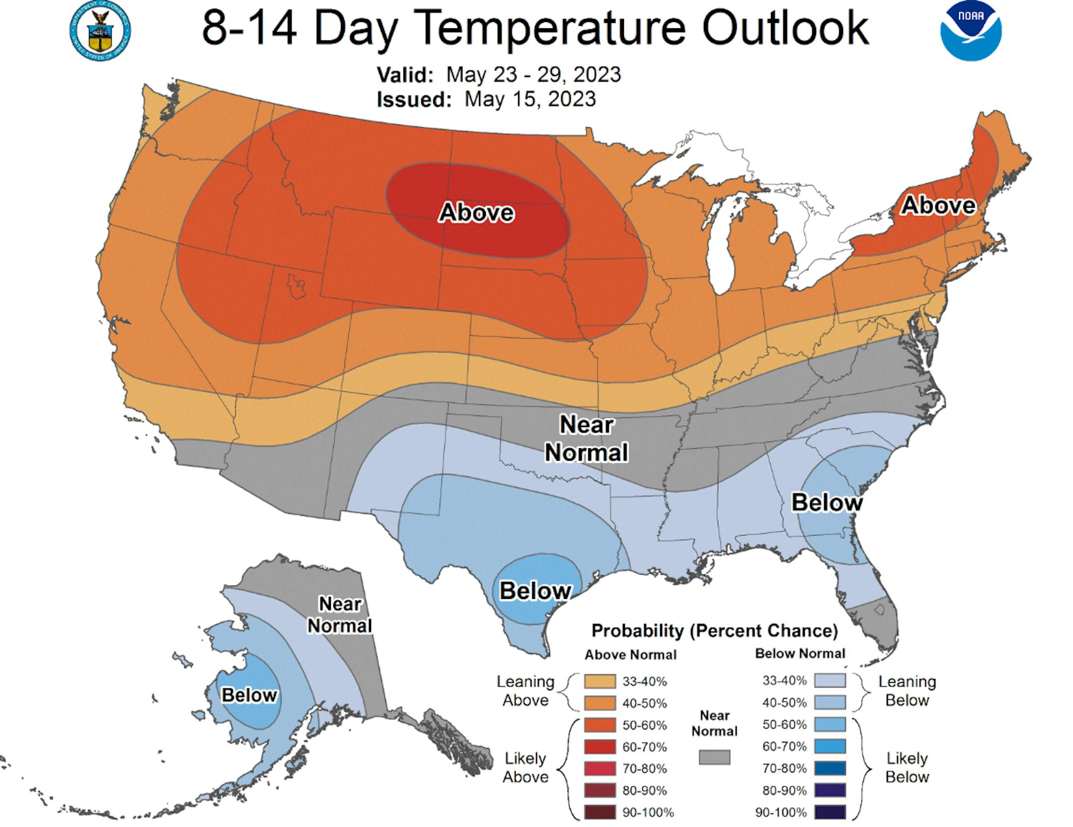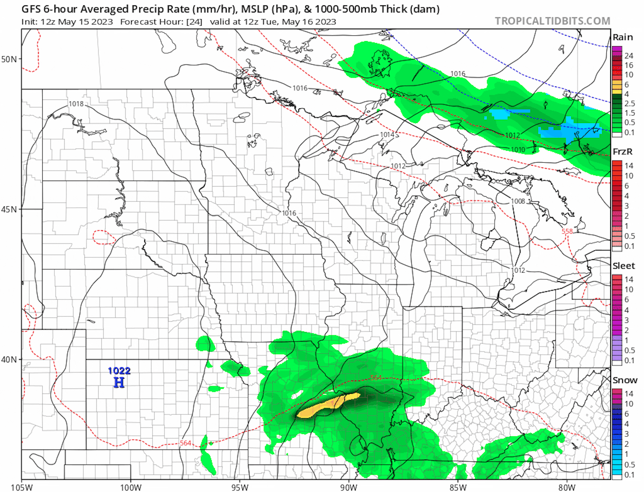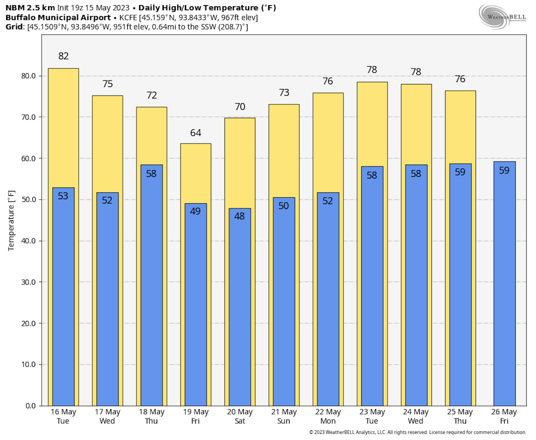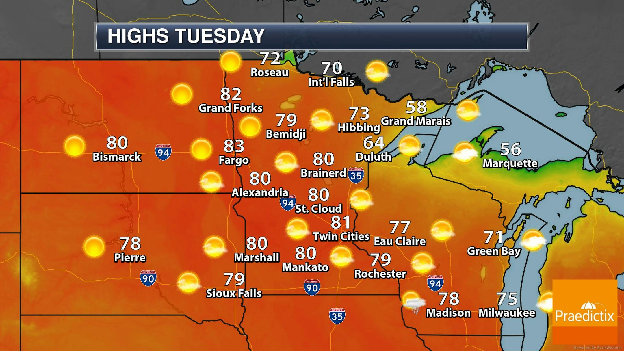 The weather outlook for the Twin Cities on Tuesday, May 16th shows another sunny and mild day with highs warming into the lower 80s for the Twin Cities. Thanks to Canadian wildfires, skies will be fairly smoky/hazy with some air quality concerns north of the Twin Cities.