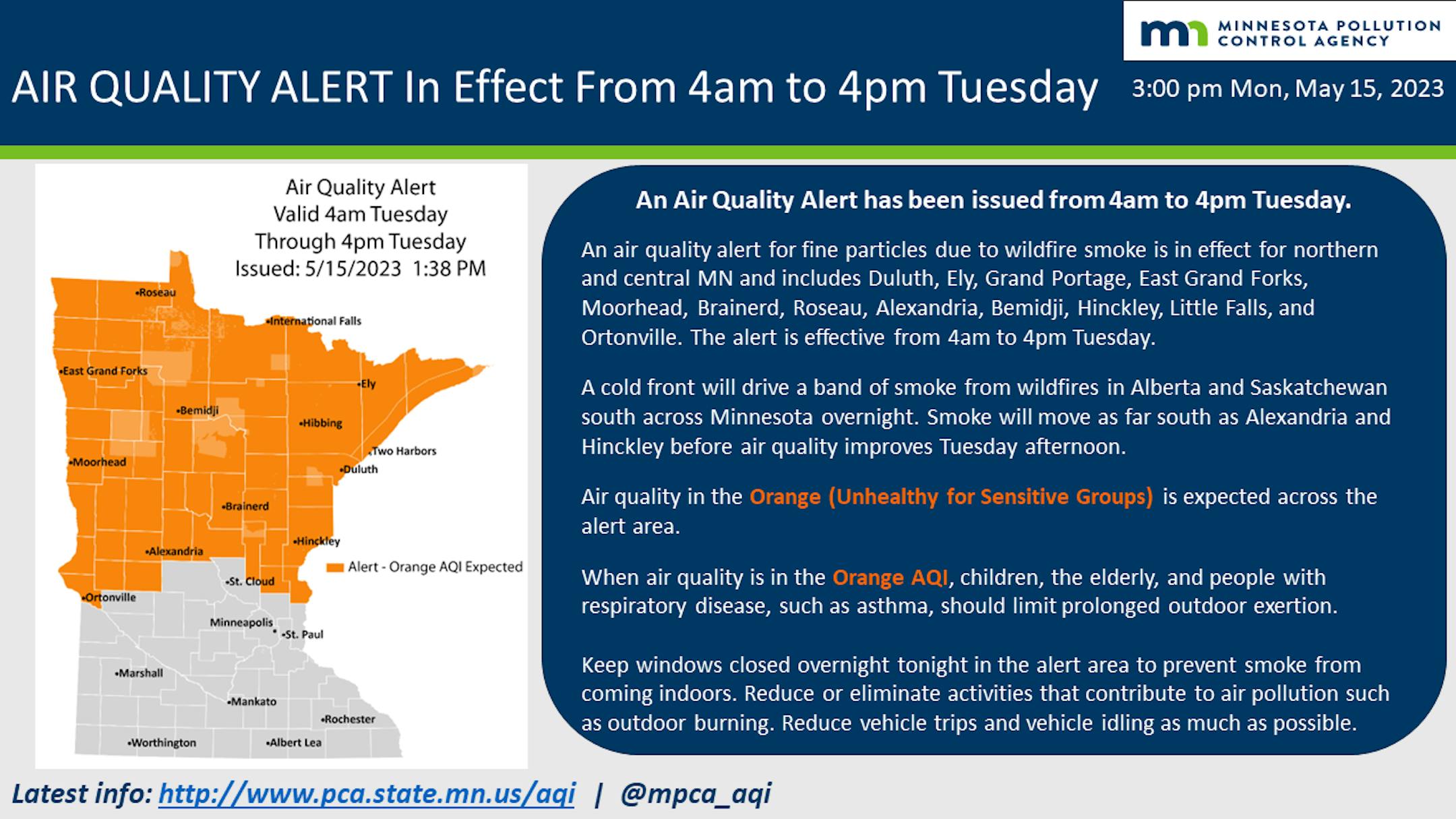 An Air Quality Alert has been issued for the northern half of Minnesota from 4am to 4pm Tuesday. Smoke from fires in Canada will be pushed southward along a cold front overnight. Orange (Unhealthy for Sensitive Groups) AQI is forecasted in the alert area.