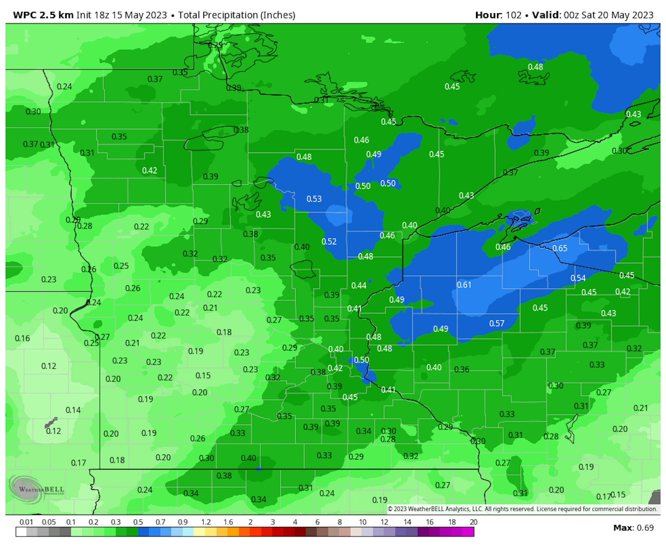 The precipitation outlook through the end of the week doesn't appear to be all that impressive with some locations seeing 0.25" to 0.50" tallies. The heavier amounts of up to 0.50" will be found closer to northeastern Minnesota and into northern Wisconsin.