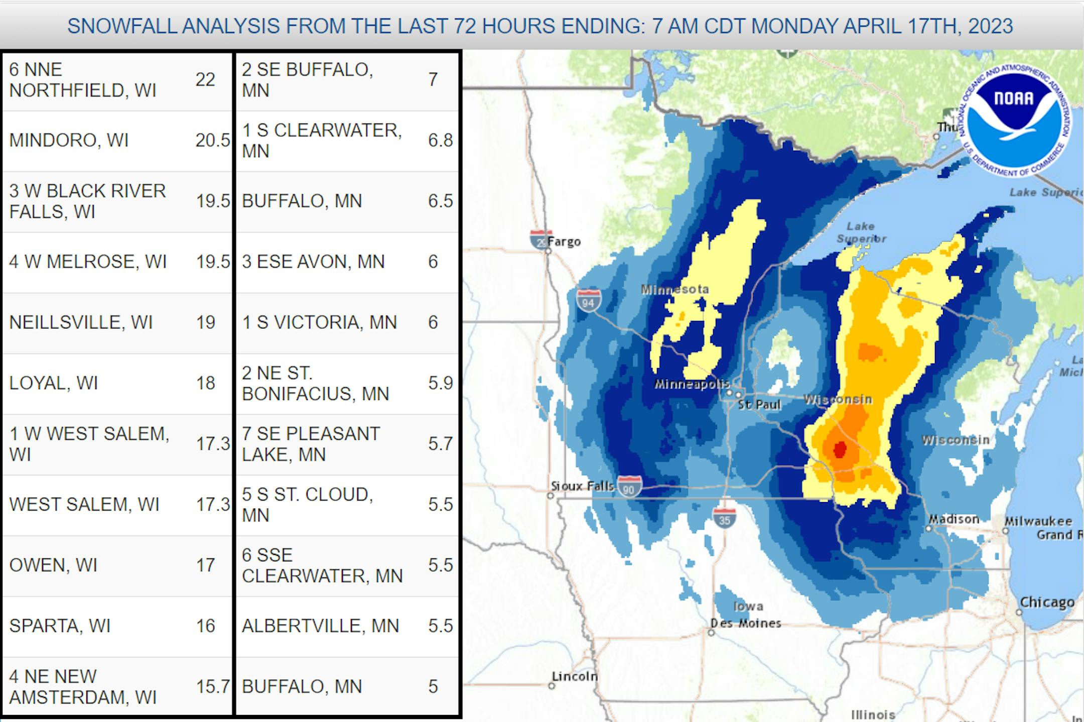 There were 2 swaths of heavy snowfall across the region over the weekend into Monday. The heaviest set up across central Wisconsin, where some of the heaviest tallies exceeded 10" to 20". There was another swath across parts of Central Minnesota that produced some 4" to 6" and isolated higher tallies north and west of the Twin Cities.
