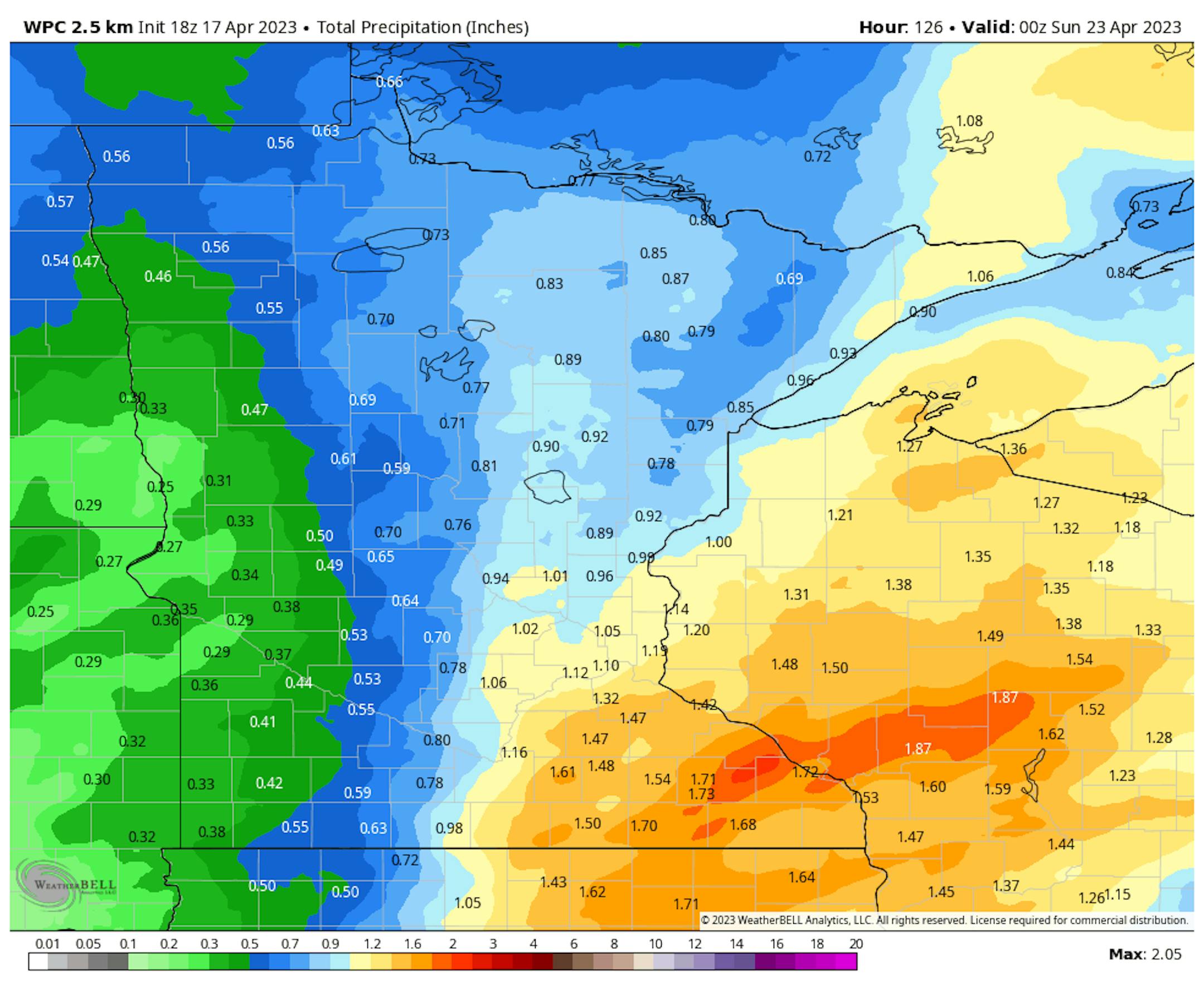 The extended precipitation outlook through the weekend suggests some decent amounts across the eastern part of Minnesota and into Wisconsin. Some locations across the southeastern part of the state could see tallies nearing 1" or more, including near the Twin Cities.