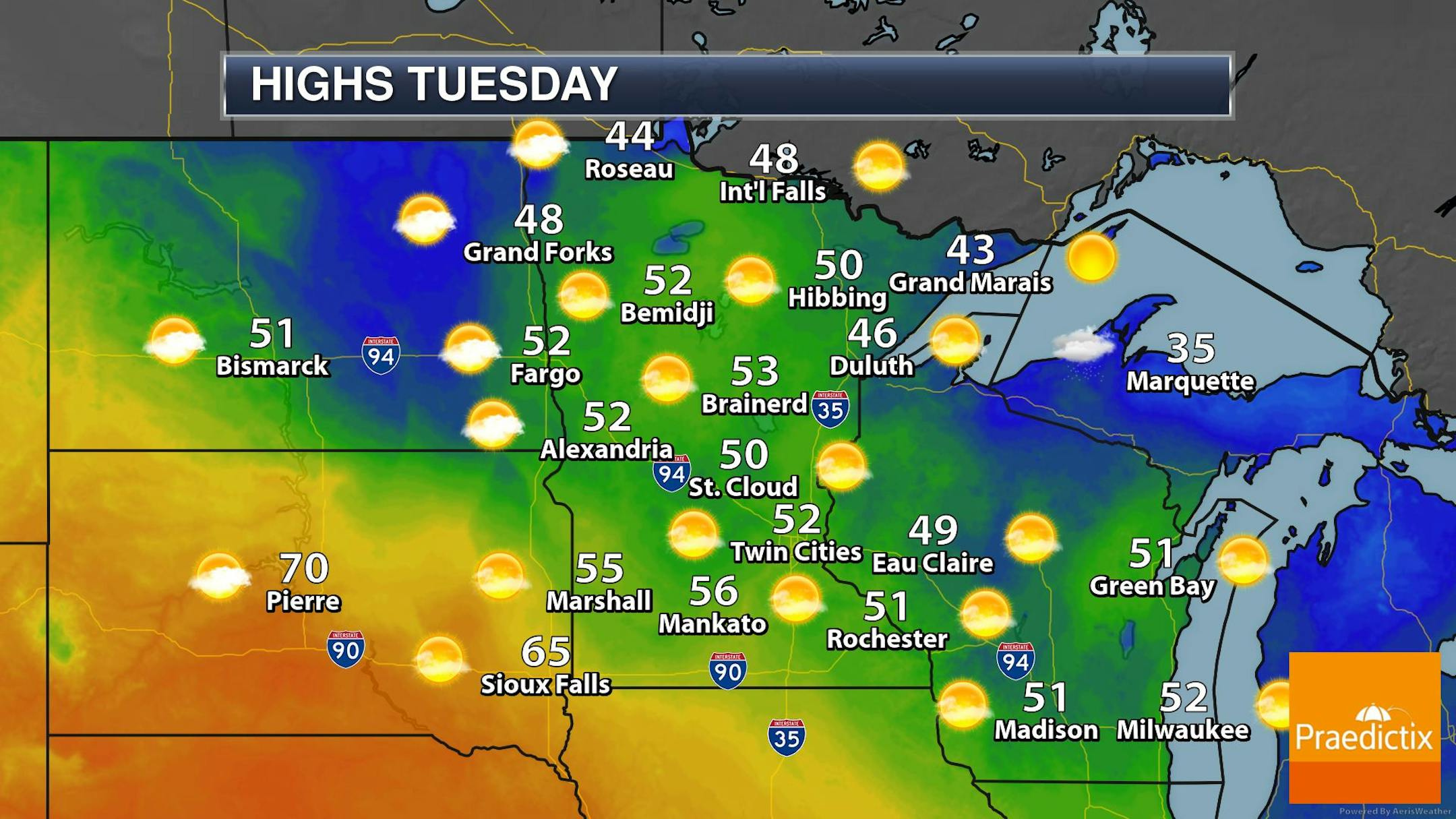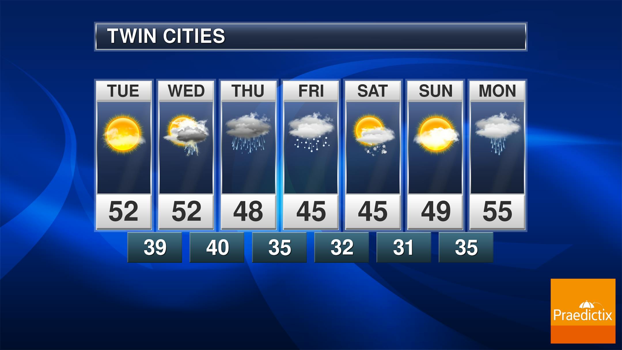 After a quieter Monday and Tuesday, another storm system will move into town Wednesday through Friday with rain and snow potential across the region. The heaviest snowfall looks to stay across the northern half of Minnesota. Stay tuned...
