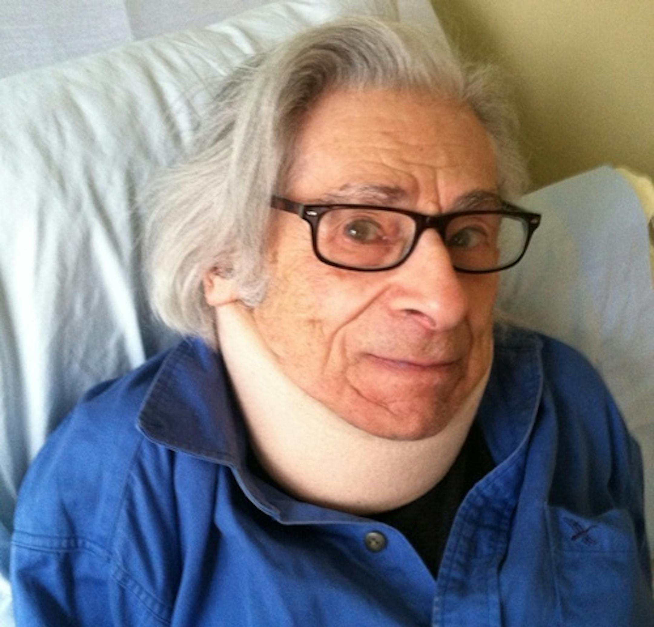 Al Milgrom with the neck brace he'll need to wear for at least a couple more months as he recovers from an accident in Berlin.