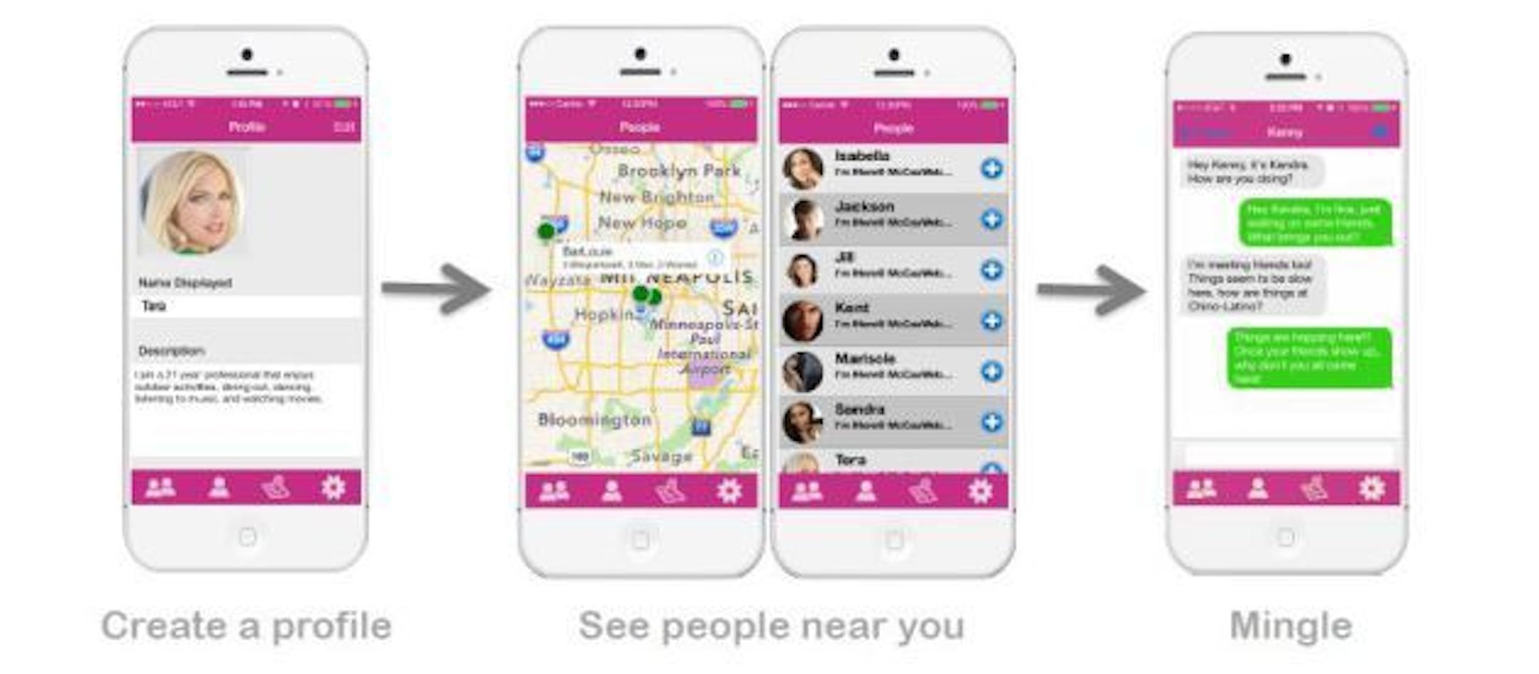 As McCaa pitches it, Mingle@ is a social network focused on helping you meet people and being social in-person. The app uses the geo-location on your phone to show you profiles of other users nearby. Profiles include photos and any details users want to share about their interests, marital status and the kinds of people they'd like to meet. Users can exchanges messages and arrange meetups.