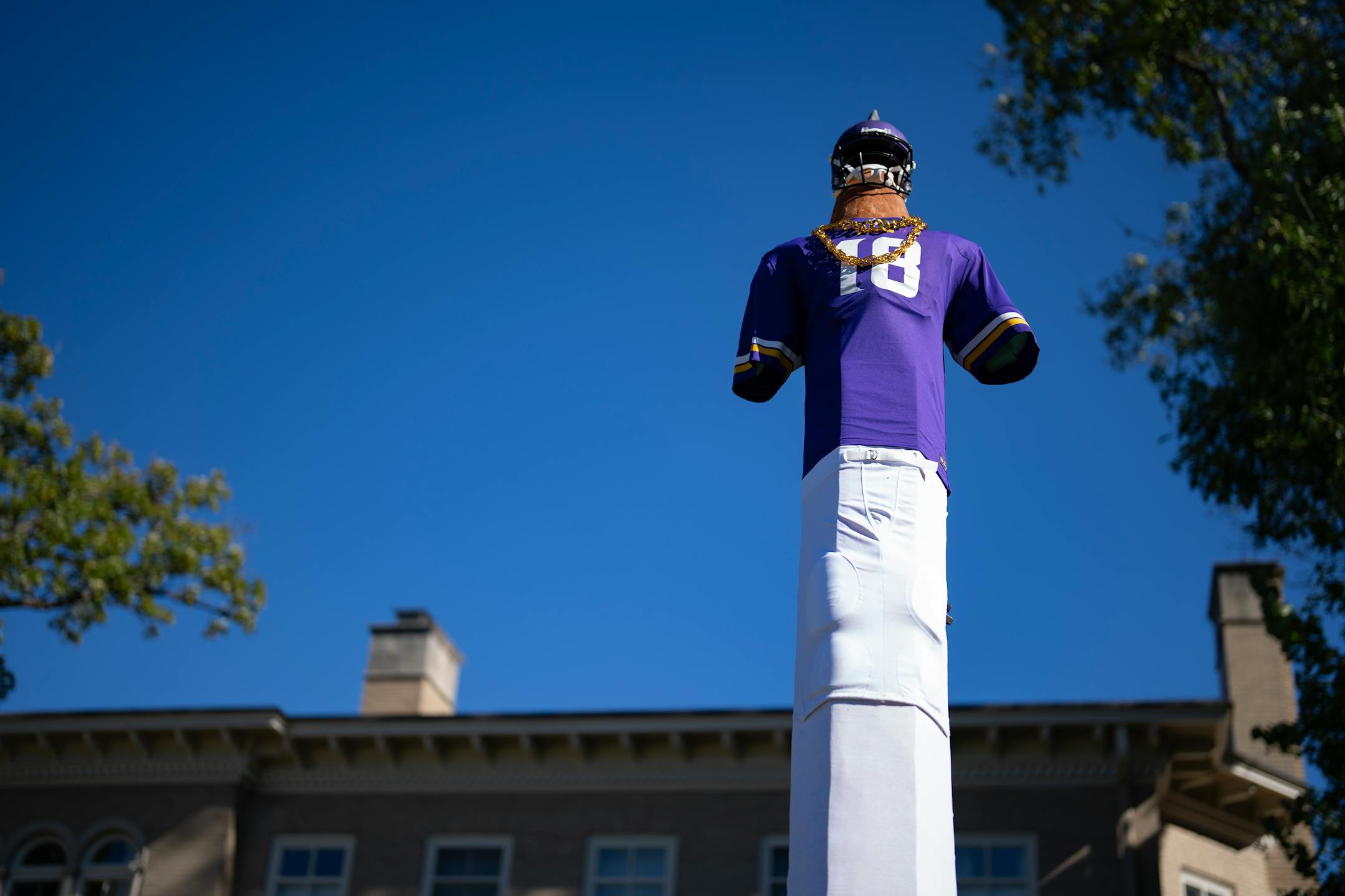 It’s dressed up as Vikings wide receiver Justin Jefferson, donning a 4XL-sized No. 18 Vikings jersey, huge gold chains, a mouth grill, oversized shoulder pads, big white pants — and old-school tube socks with purple stripes.