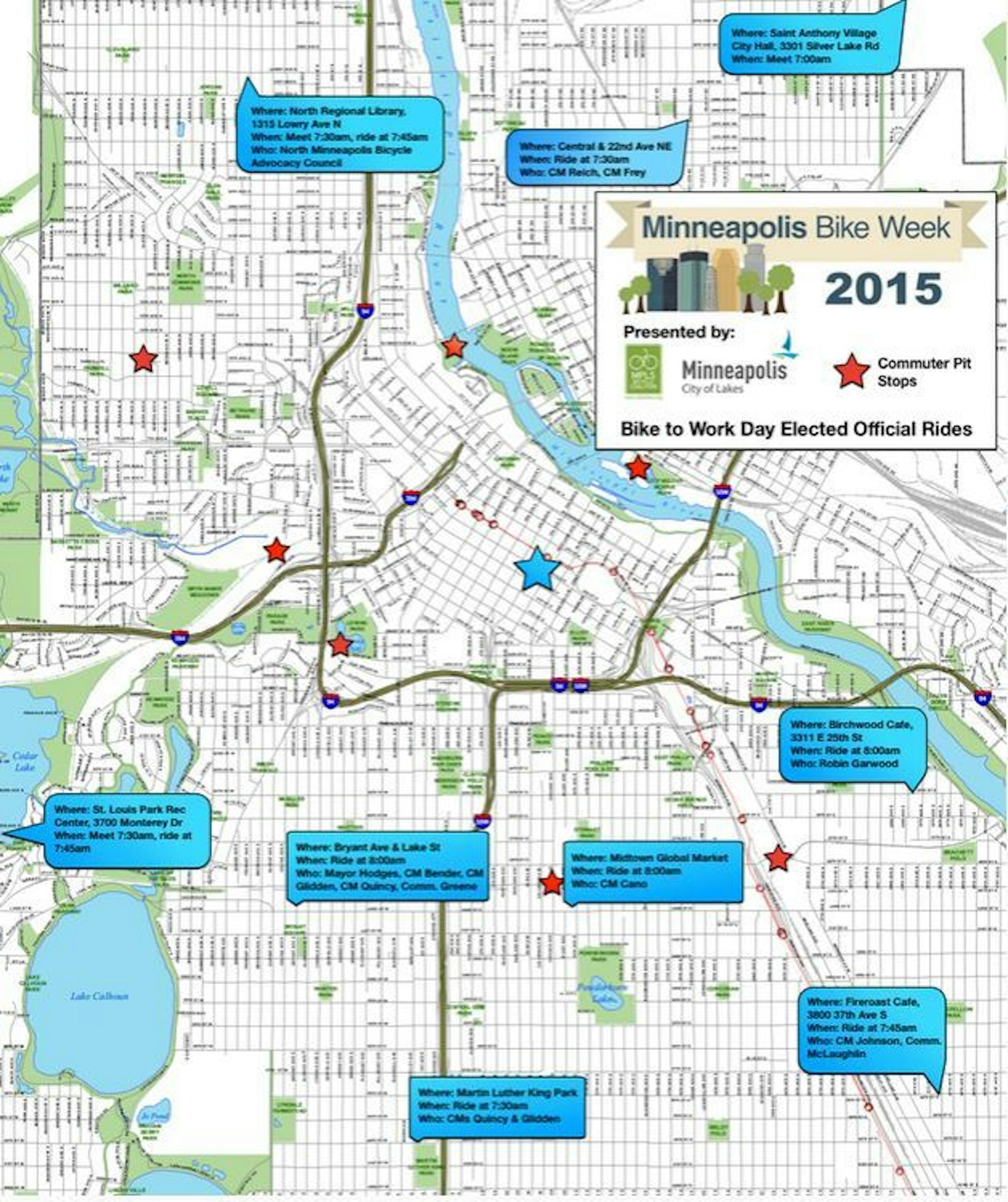 Here is a list of some of the group rides being led by elected officials. Below is a map showing some of the Pit Stops.