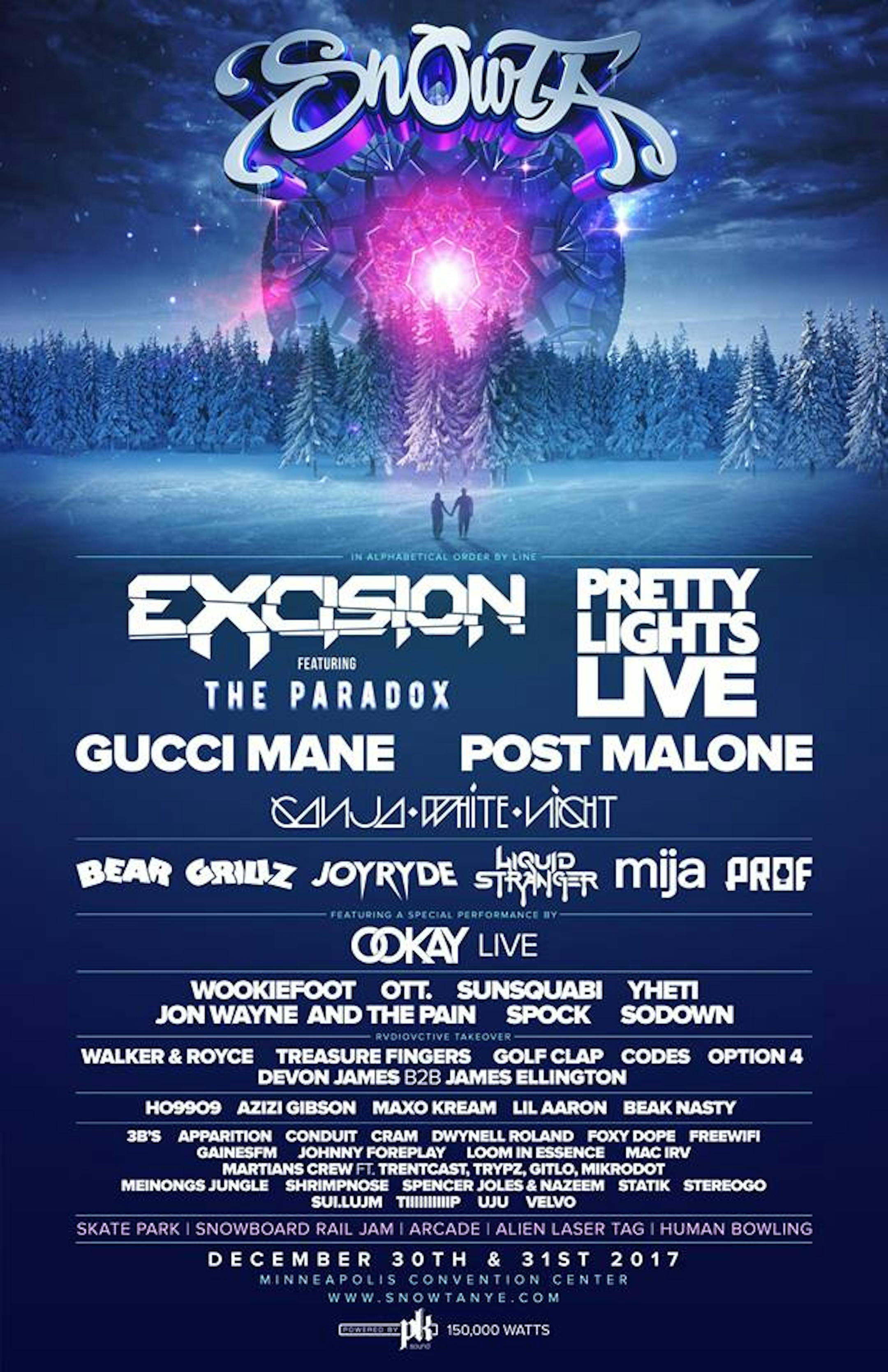 The second annual electronic-dance/hip-hop/psychedelic grooveathon -- happening New Year's weekend, Dec. 30 and 31 -- has confirmed an impressively unconventional lineup (get it?) with EDM-style acts including Excision, Pretty Lights, Ganja White Night, Bear Grillz, Ookay, Joyryde and Mija; rappers such as Gucci Mane (who just opened for the Weeknd at Xcel Center on Sunday), Post Malone and locals Prof, Mac Irv, Nazeem & Spencer Joles and Dwynell Roland; and rock acts Ho99o9, Wookiefoot and John Wayne & the Pain. See the full lineup in the poster below.