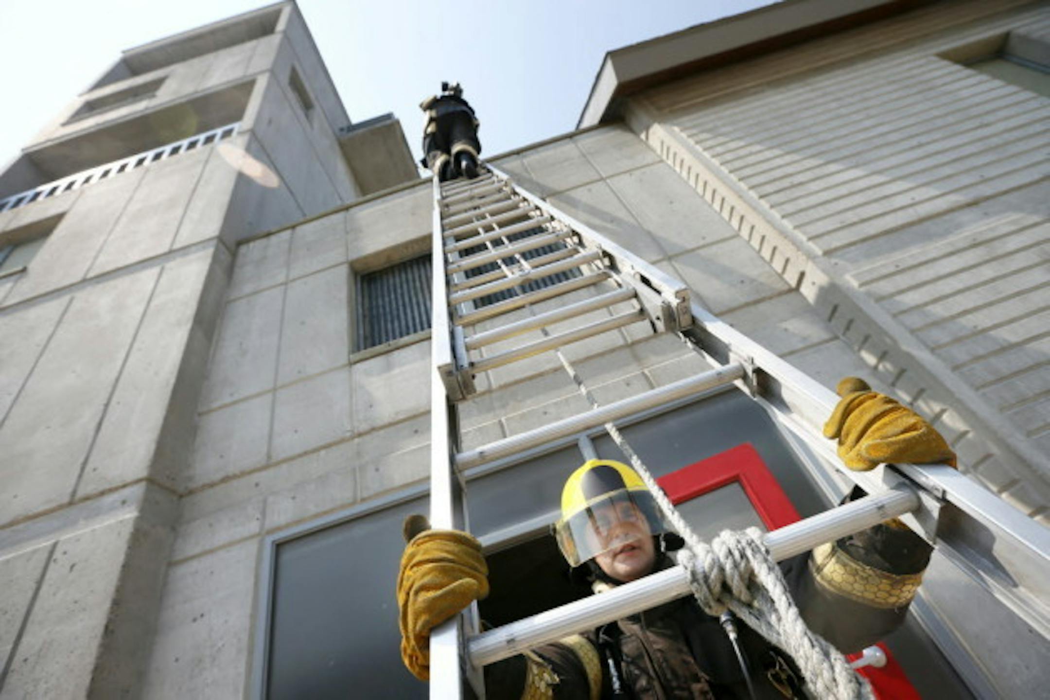 Above: Minneapolis fire recruit Logan Lauritsen holds a ladder in place during an exercise at the Fire Department's training facility in 2013. Jerry Holt / Star Tribune