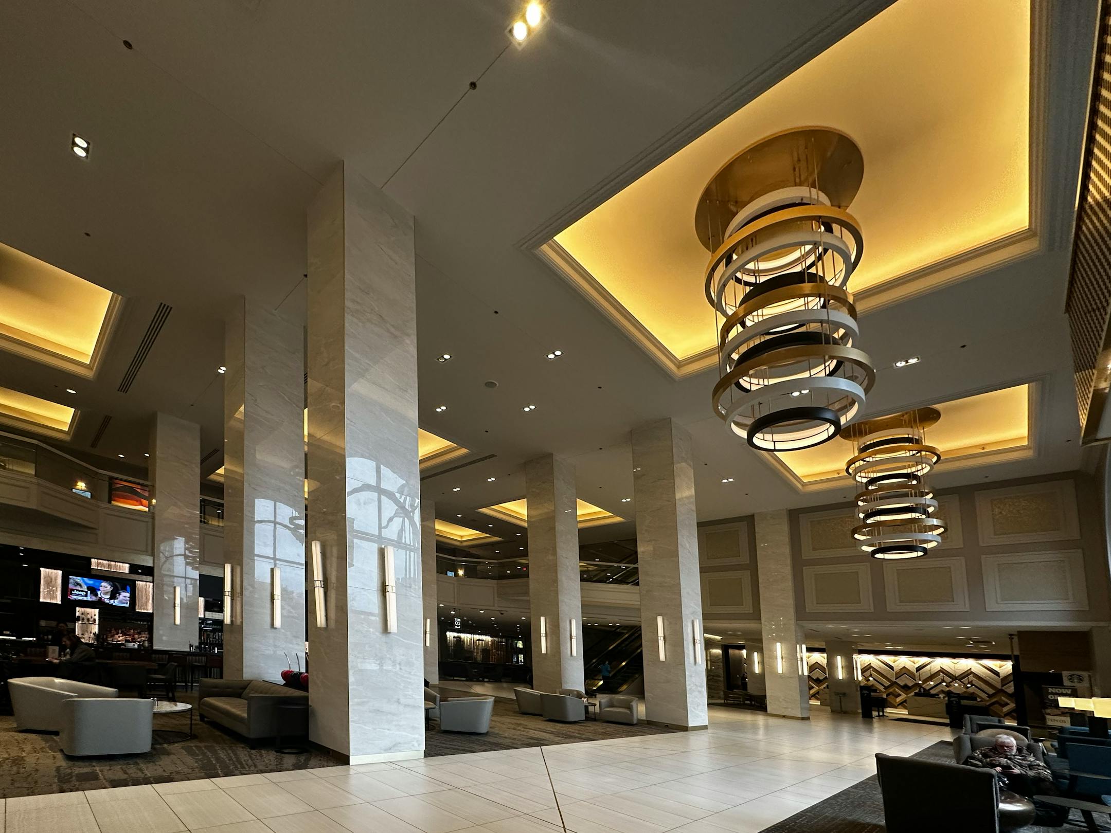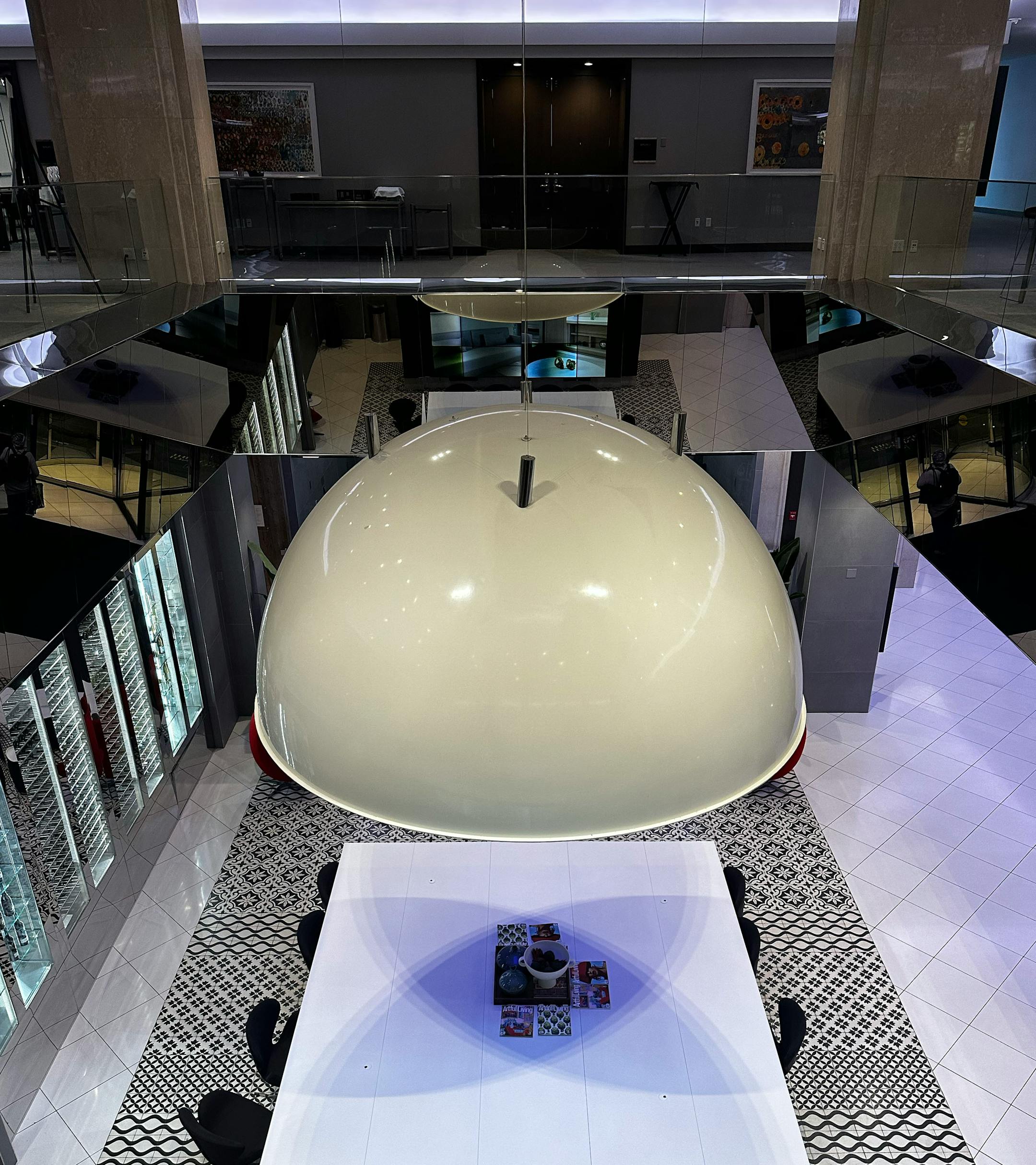 The Radisson, by the way, was replaced by — well, a Radisson, and the lobby had a big stone ball that revolved on a cushion of water. It’s now the Royal Sonesta, with an enormous table in the middle of the lobby and a gigantic cone overhead, looking as if it could descend and vacuum up everyone.