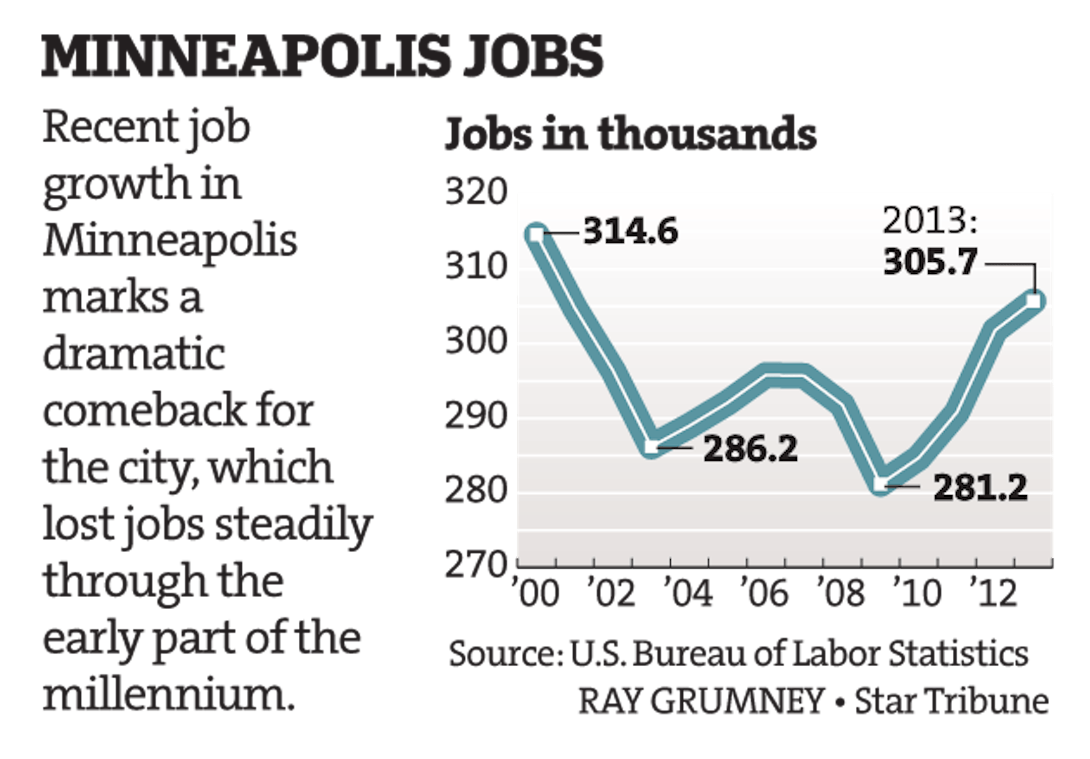 Recent job growth in Minneapolis marks a dramatic comeback for the city, which lost jobs steadily through the early part of the millennium.