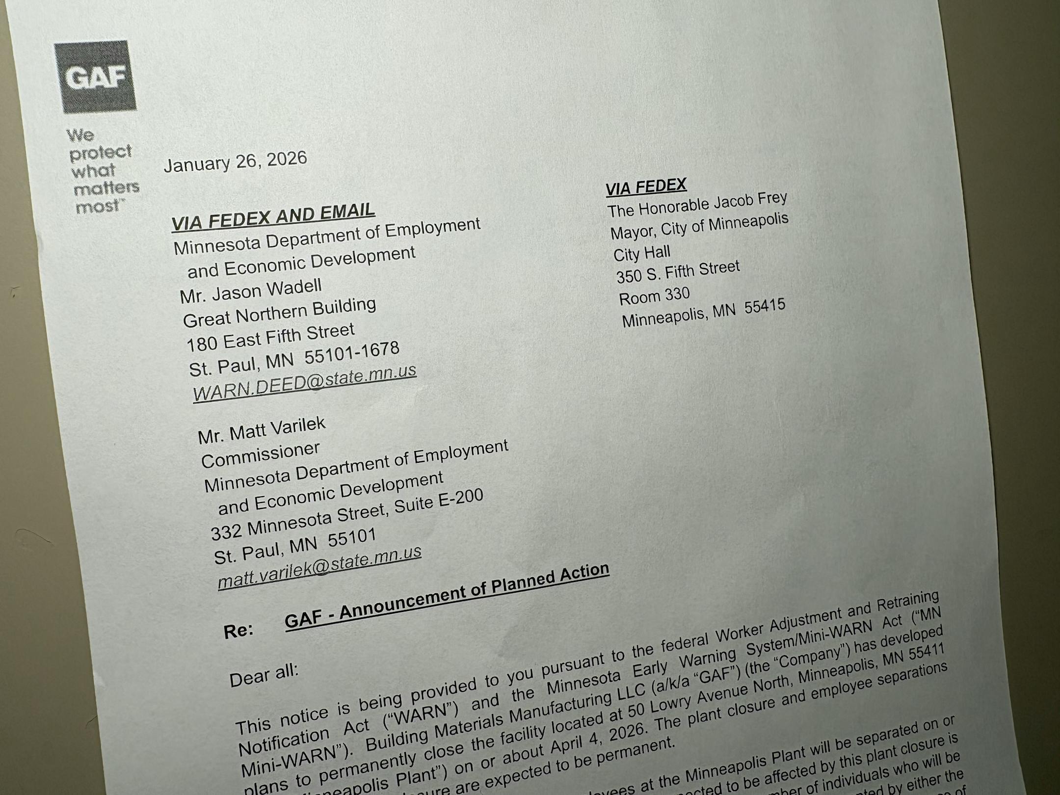 A GAF spokesperson reached Tuesday said the decision to sunset the Minneapolis plant was partially tied to the age of the building and equipment and the need to invest efficiently across its nationwide network, which stretches “coast to coast.”