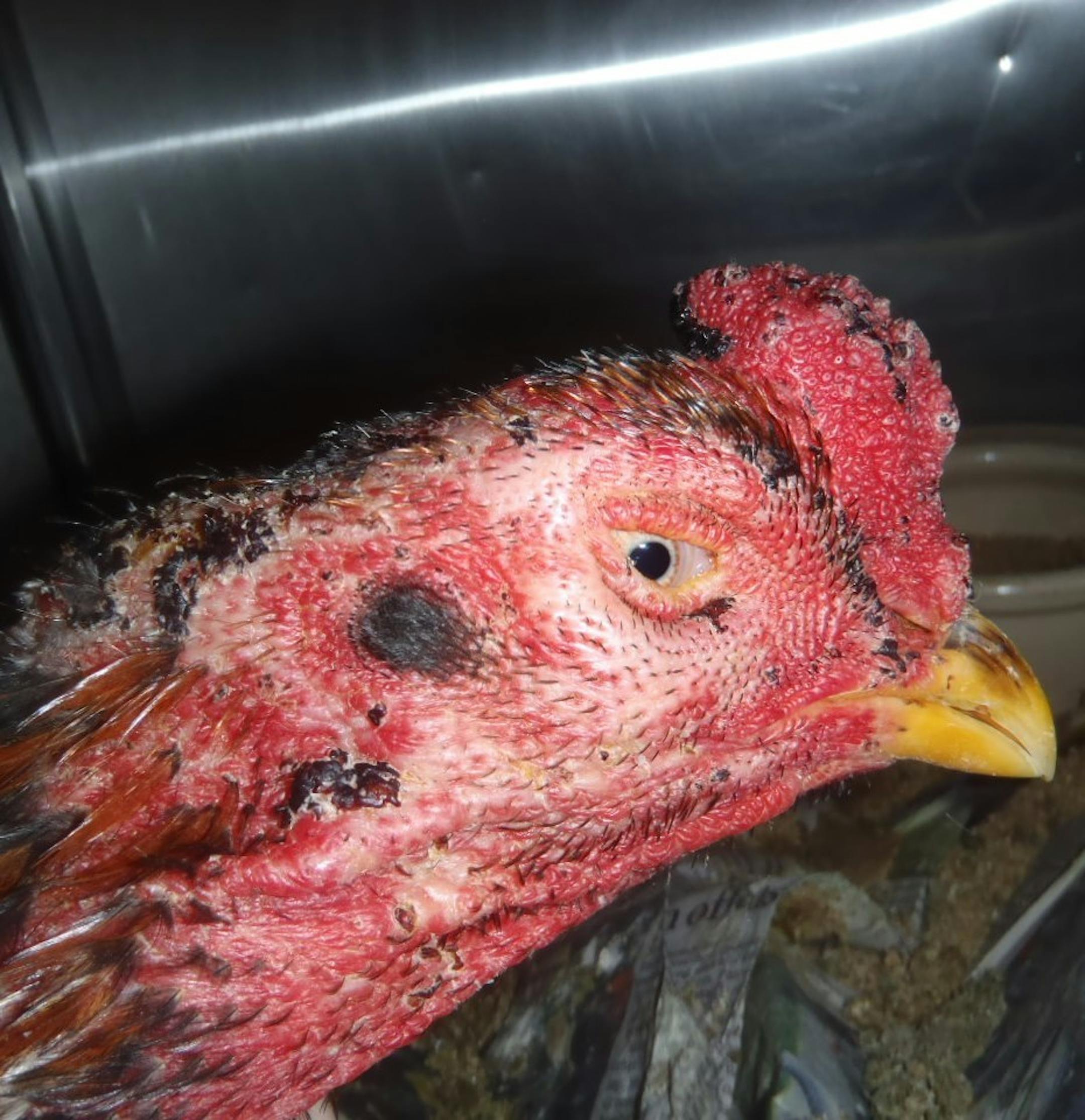 One dead rooster was found with duct tape on its rounded leg spurs, which city animal control officials said is sometimes used to attach blades during cockfighting. The live roosters also had rounded spurs and scars on their heads.