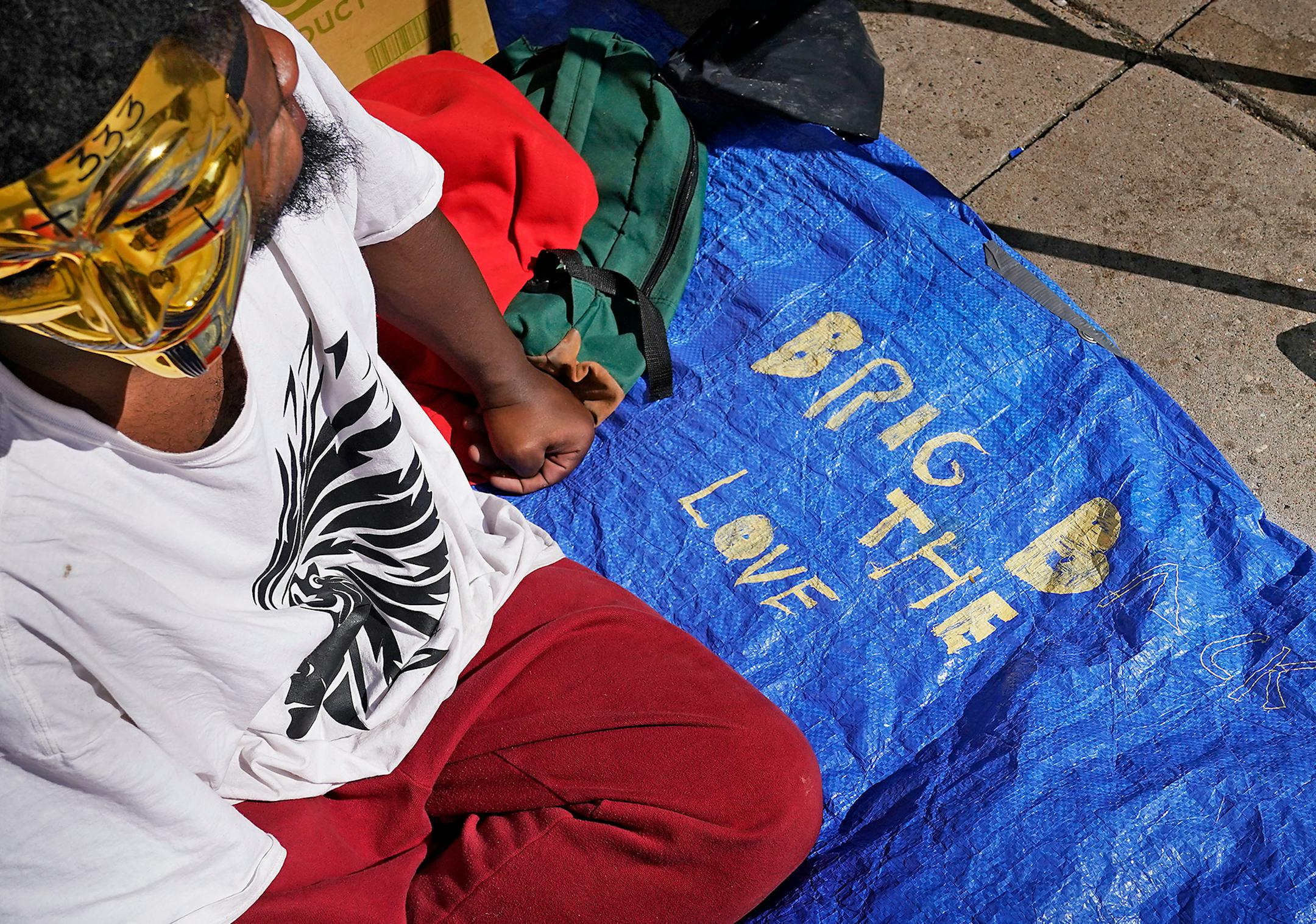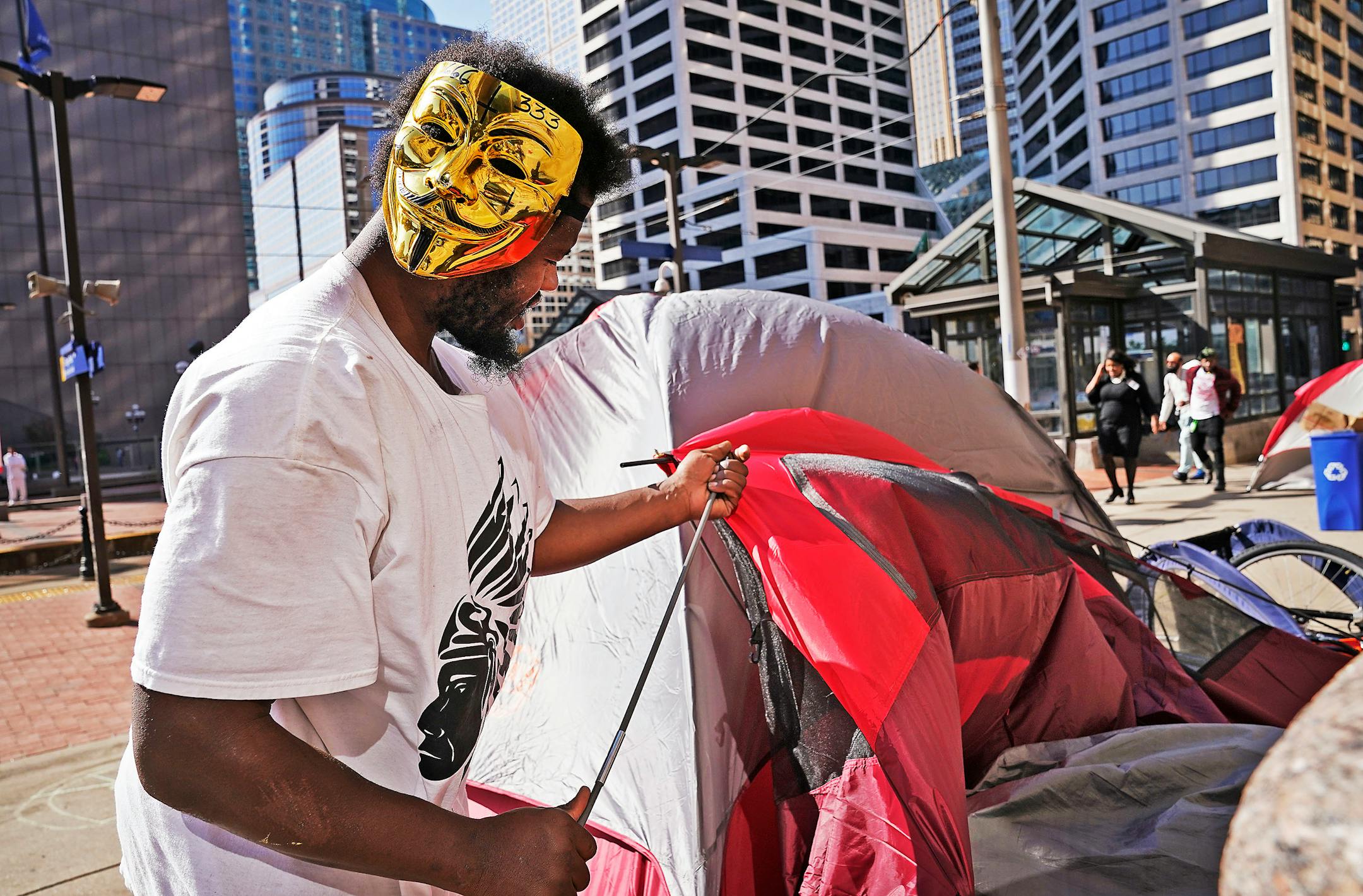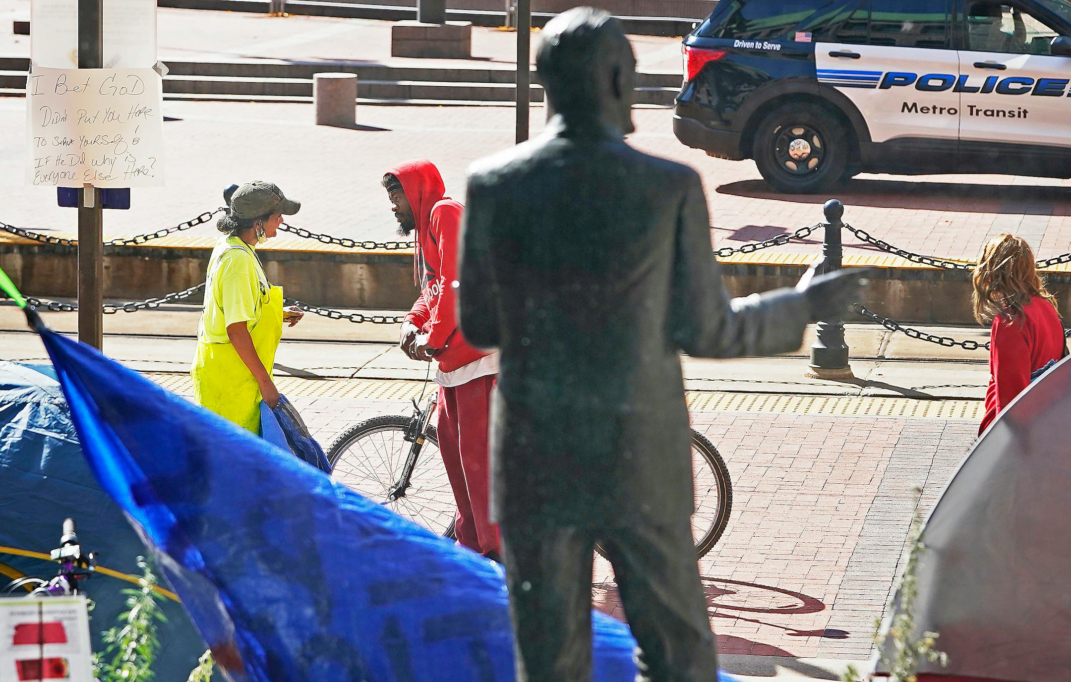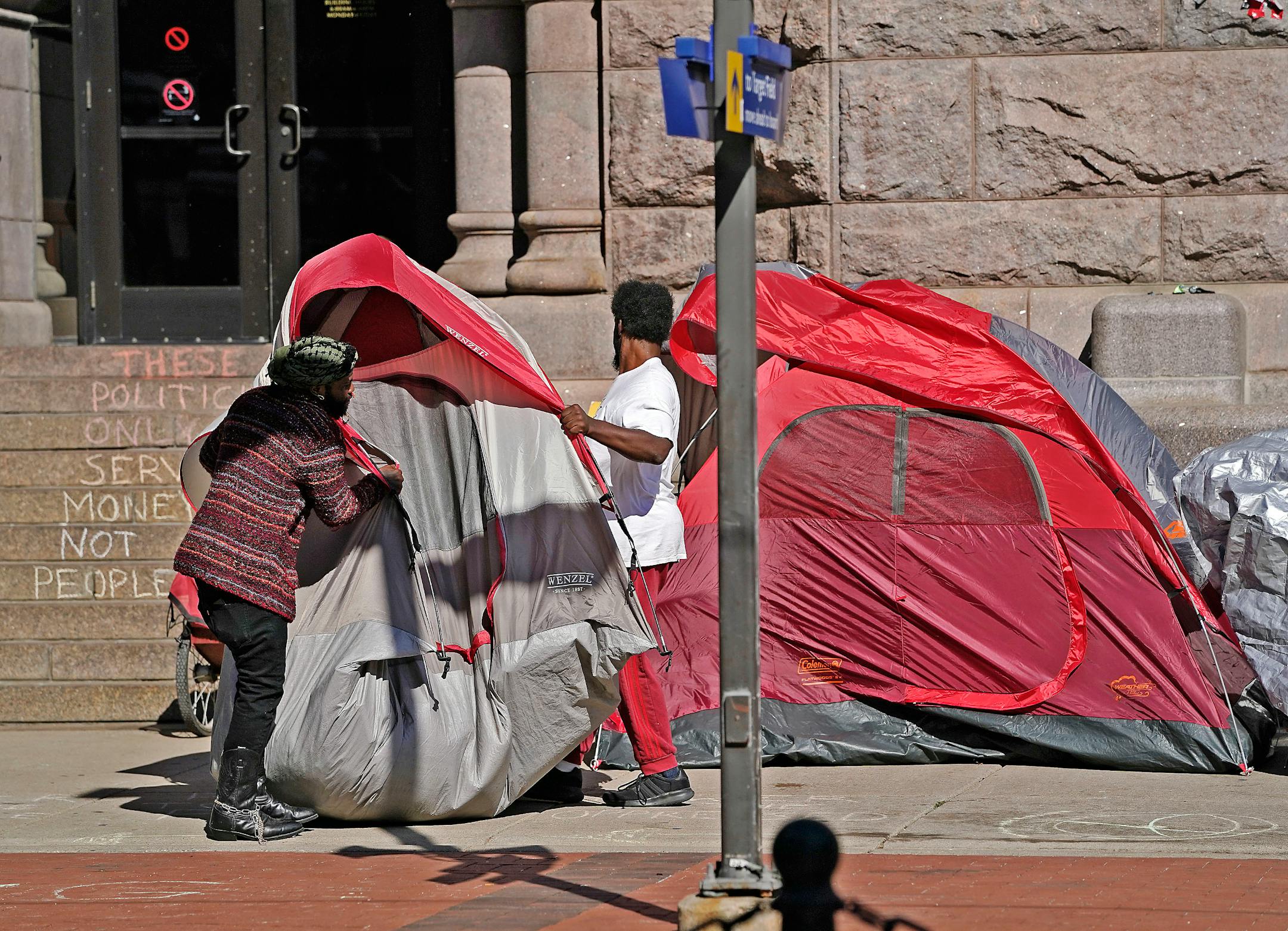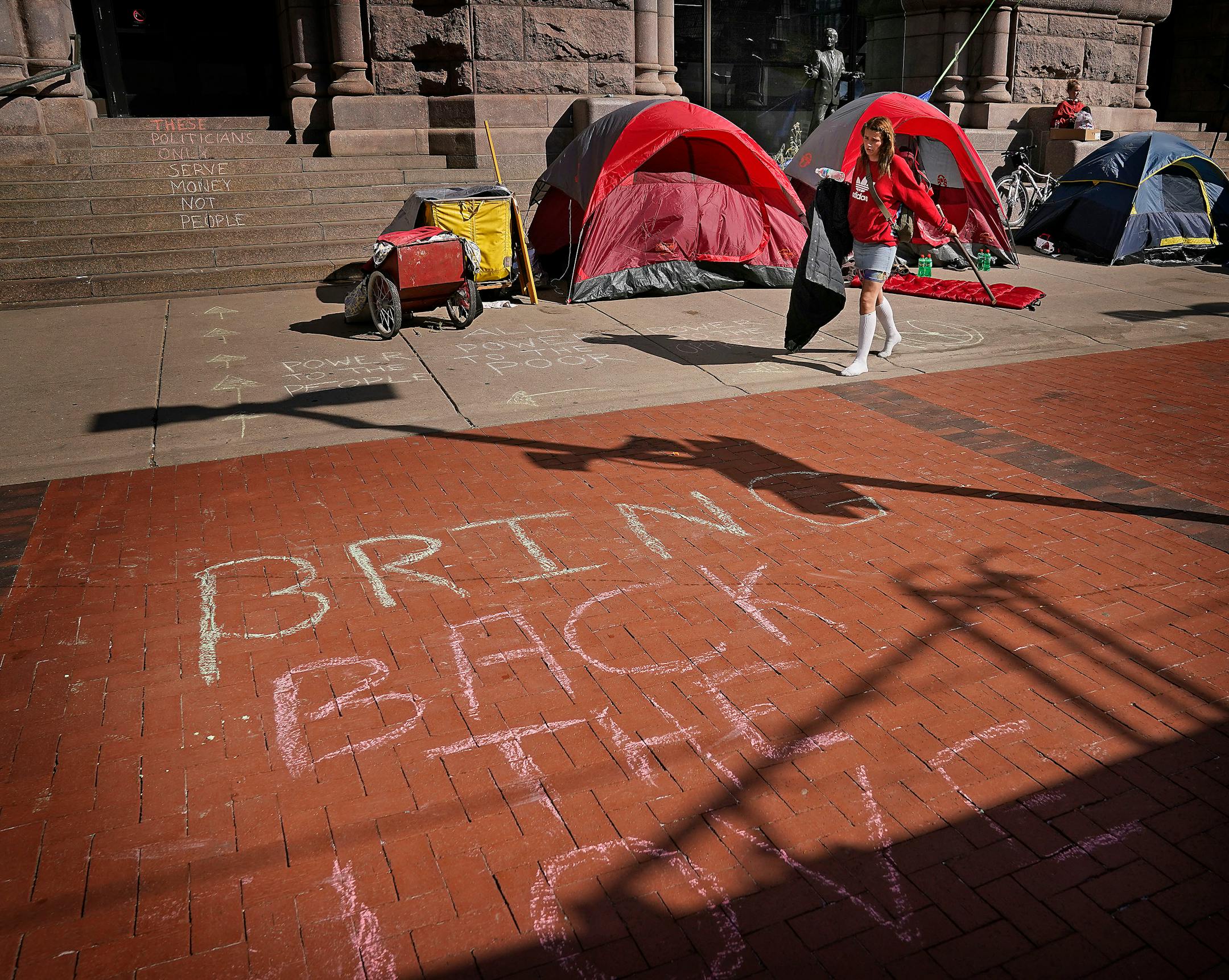 Several former residents of the Near North encampment — cleared Thursday — pitched tents outside City Hall on Sunday night. On Tuesday morning, they woke to volunteers serving breakfast.