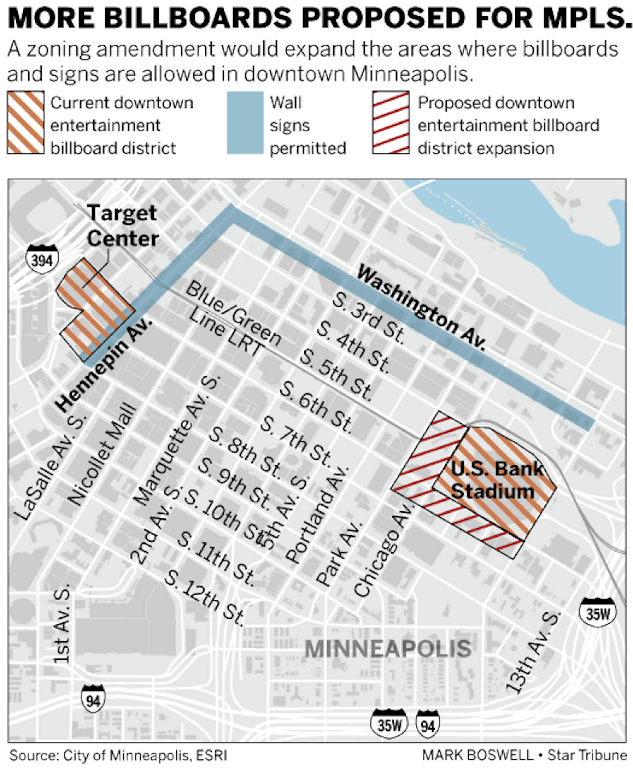 A zoning amendment would expand the areas where billboards and signs are allowed in downtown Minneapolis.