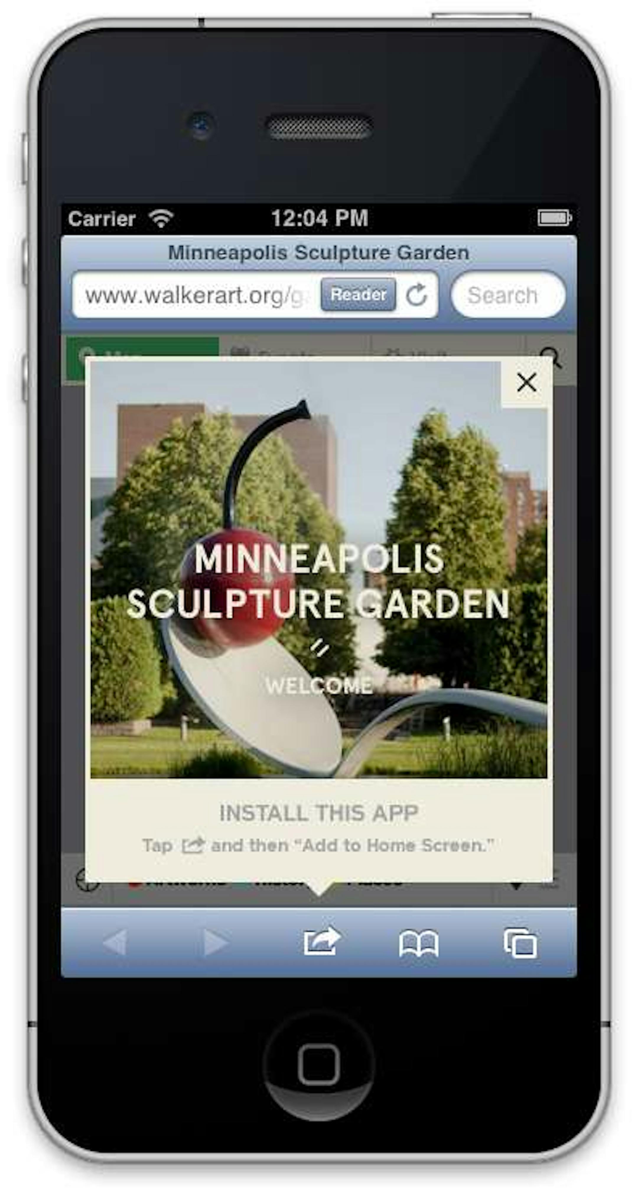 Walker Art Center's design and "New Media Initiatives" departments have produced a new website for the Minneapolis Sculpture Garden along with a free mobile app. The web app enables visitors to tour the garden using GPS location technology, to view audio and video information about the sculptures, check up on the Garden's history, and hear short interviews with artists and local luminaries including Minneapolis Mayor R. T. Rybak. The MSG, which opened 25 years ago, is a joint project of the city of Minneapolis, which owns the land, and Walker, which owns the sculpture displayed there.