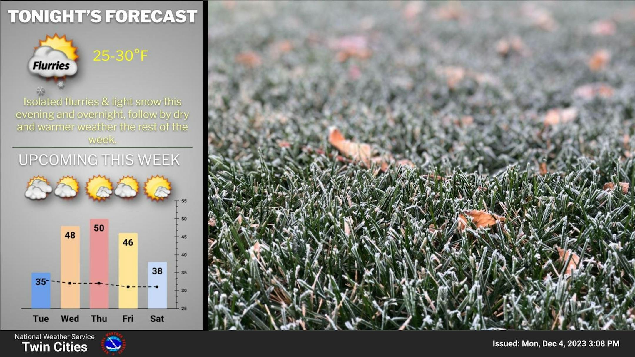 The Twin Cities is off to a slow start when it comes to December winter weather, but a light dusting of snow fell across the region Monday night and could last through the next day or so.