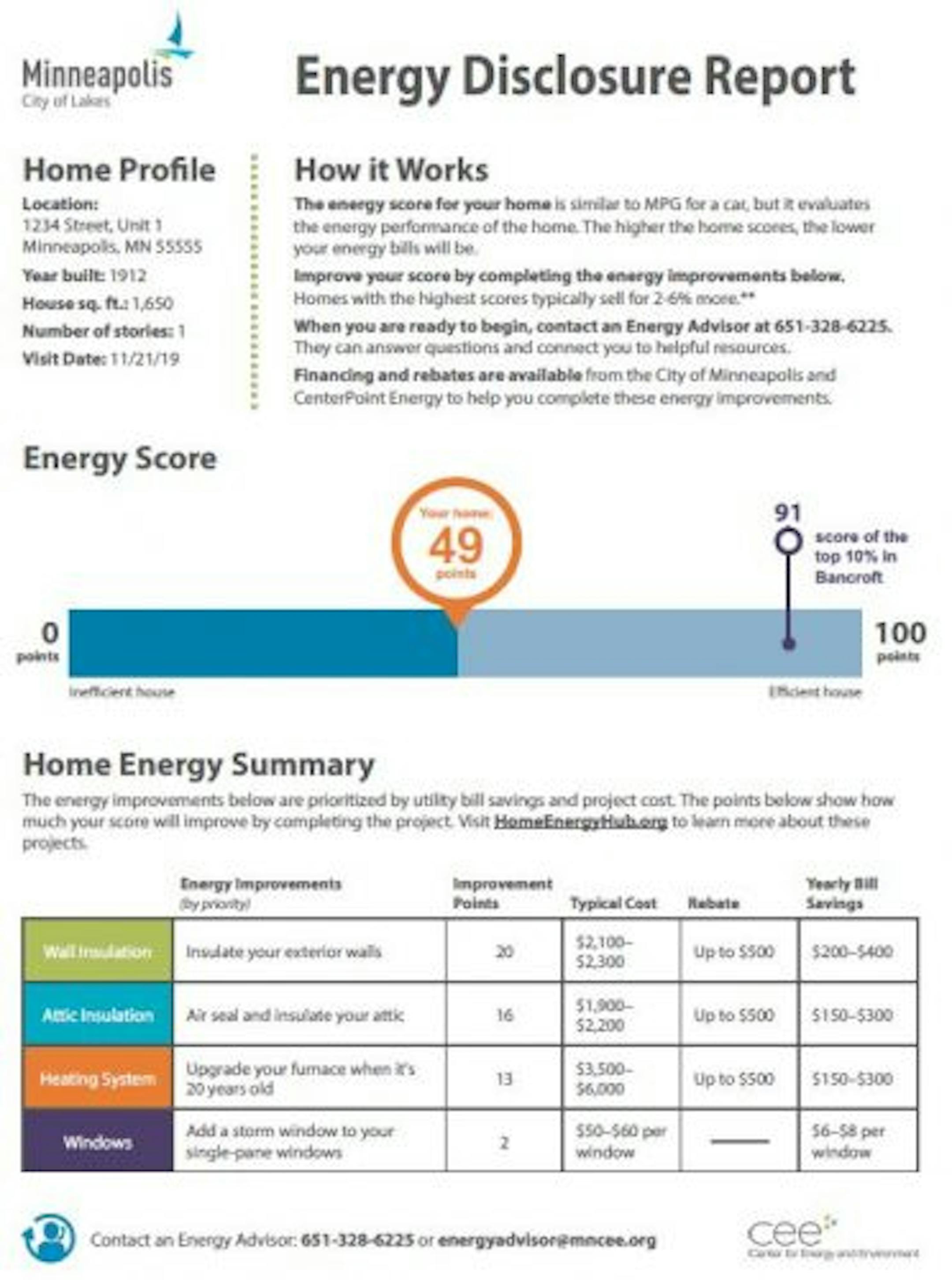 The report will also include recommendations on what can be done to improve a home's energy score. The City of Minneapolis also offers 0% financing to residents that complete energy upgrades. Utility rebates may also be available. To contact an Energy Advisor for more information about basically anything related to this program, call 651-328-6225 or email energyadvisor@mncee.org.