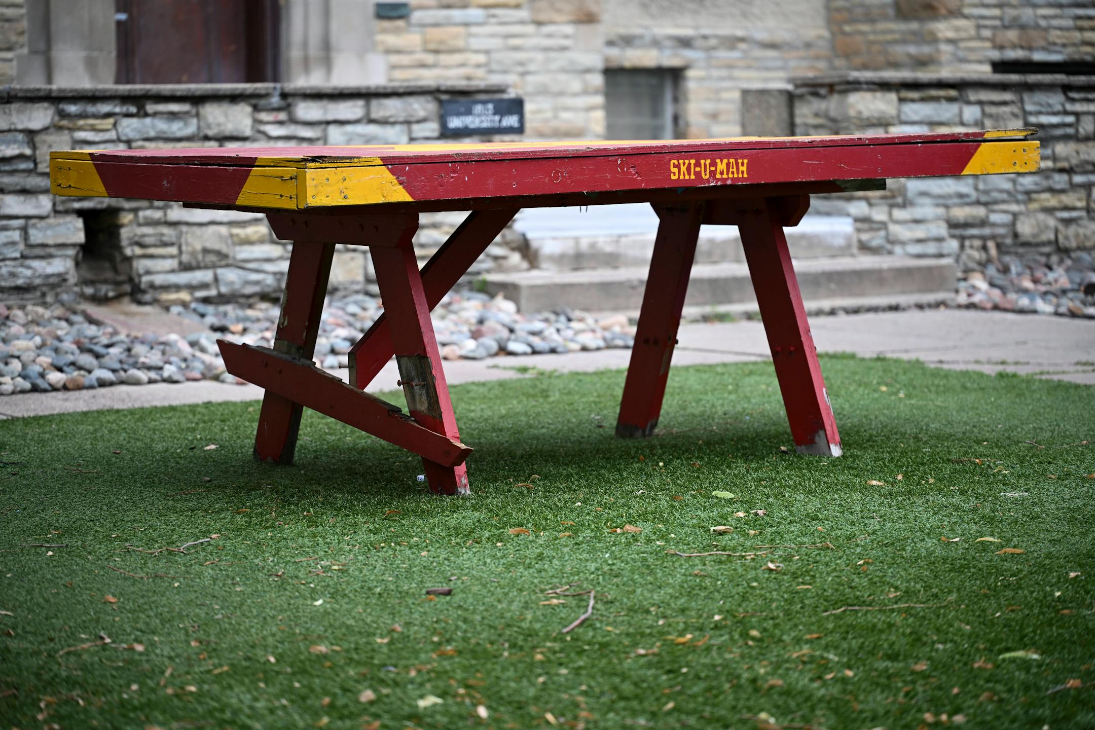 The lawns stand out against the relatively homogeneous row of ivy-draped historic brick buildings decorated with Greek letters and accented with grills and the odd overturned chair, orphaned beer can or unattended keg. The centerpiece of most front lawns is a counter-height table of workbench-like design and varying levels of craftsmanship. It’s where drinking games like flip cup are played; the evidence of foot traffic suggests this is where the action happens.
