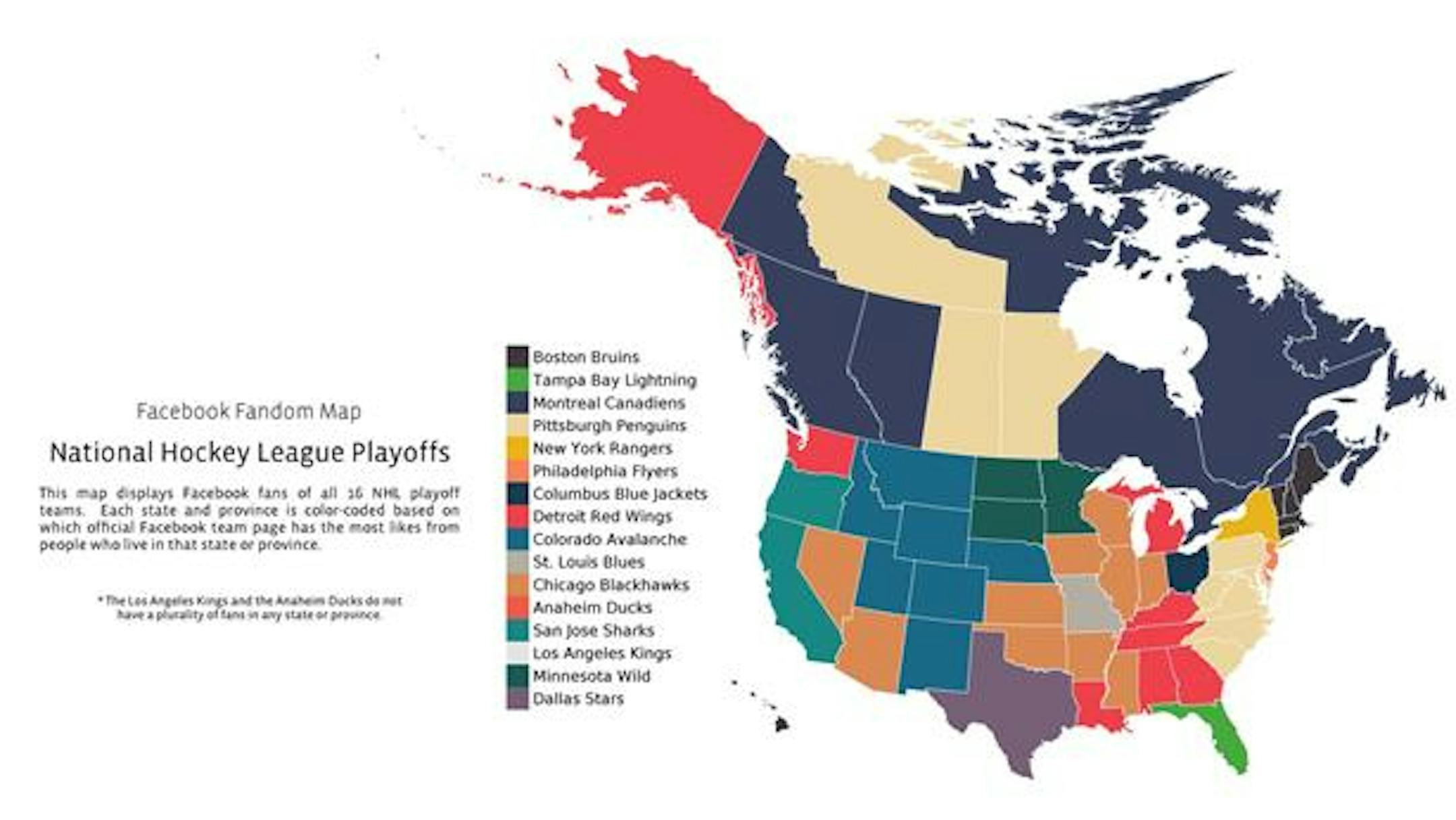 The Sporting News put together a map of which states are rooting for which teams in the NHL playoffs based on Facebook "likes." As someone who grew up in North Dakota, the results aren't terribly surprising, but: North Dakota, South Dakota and Minnesota are rooting for the Wild, while border states west and south of the Dakotas are rooting for the Avs.