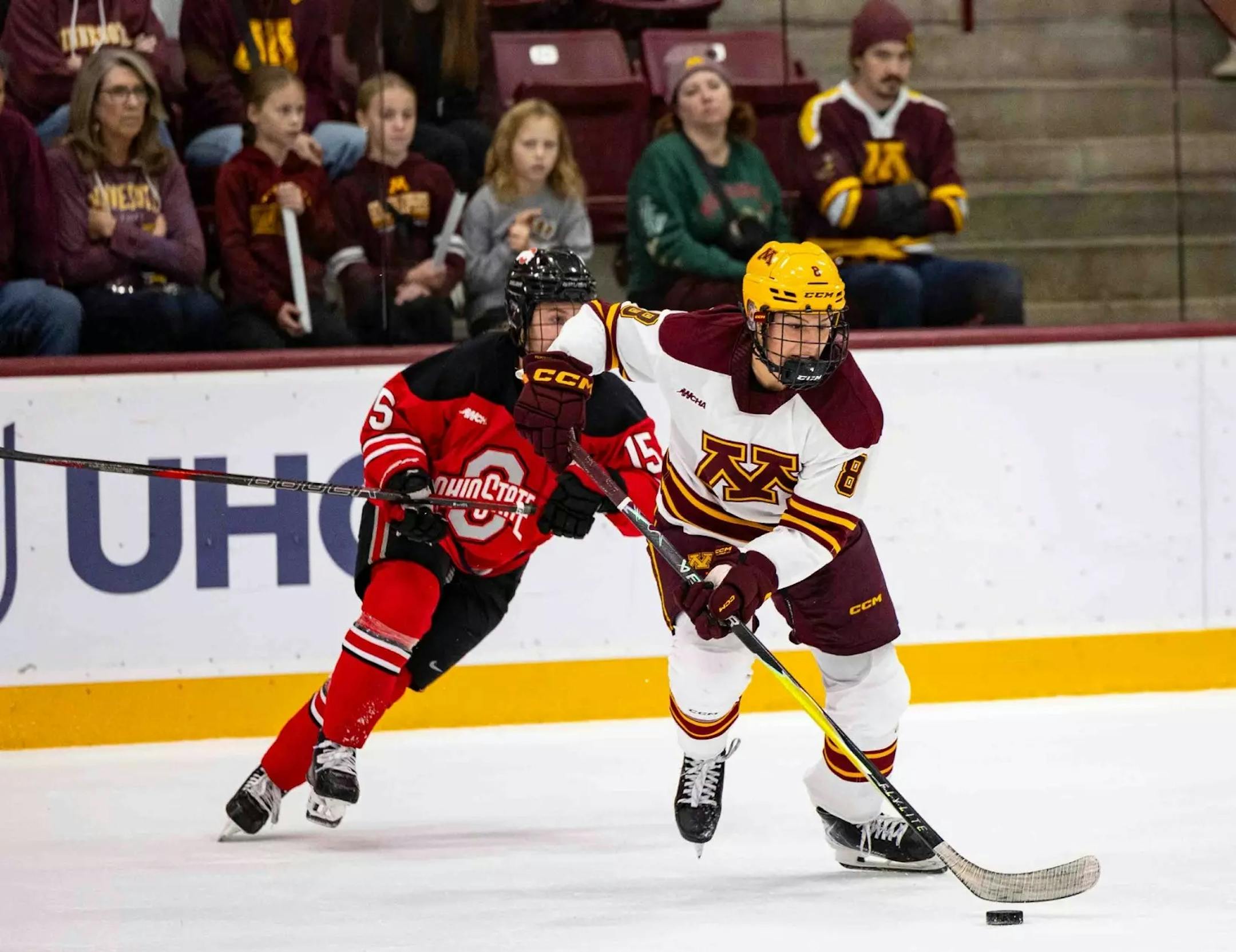 After the final horn sounded in the No. 3 Gophers’ 6-3 victory over the No. 2 Buckeyes, a fracas broke out as Ohio State’s Jordan Baxter cross-checked the Gophers’ Emma Kreisz as the junior center was down on the ice.
